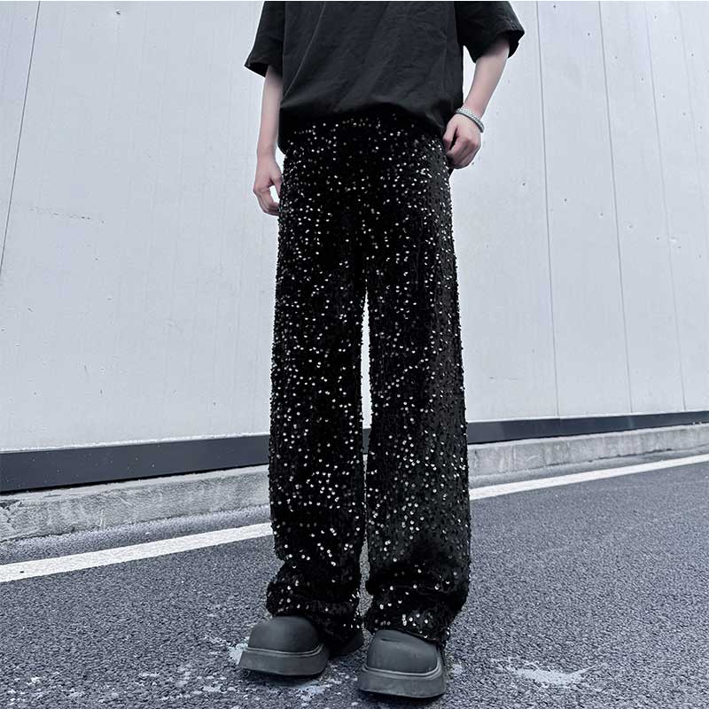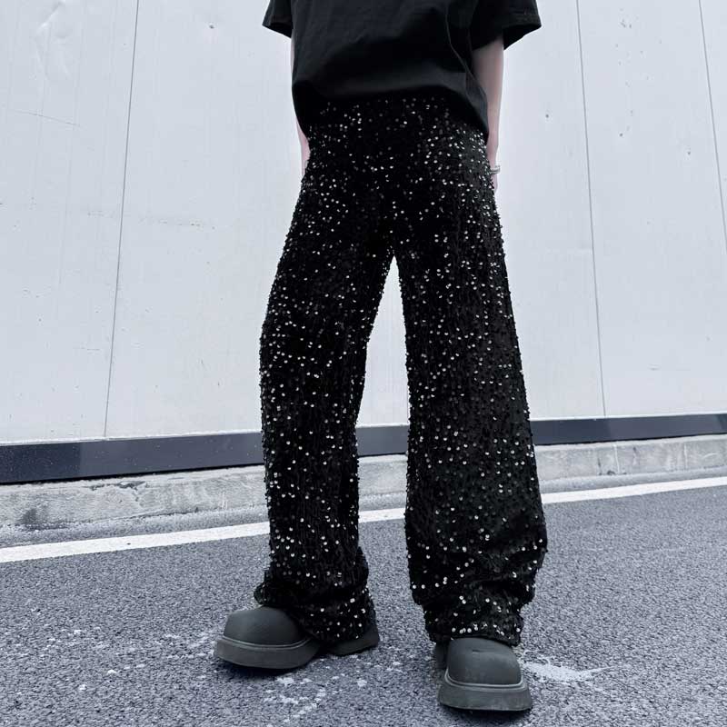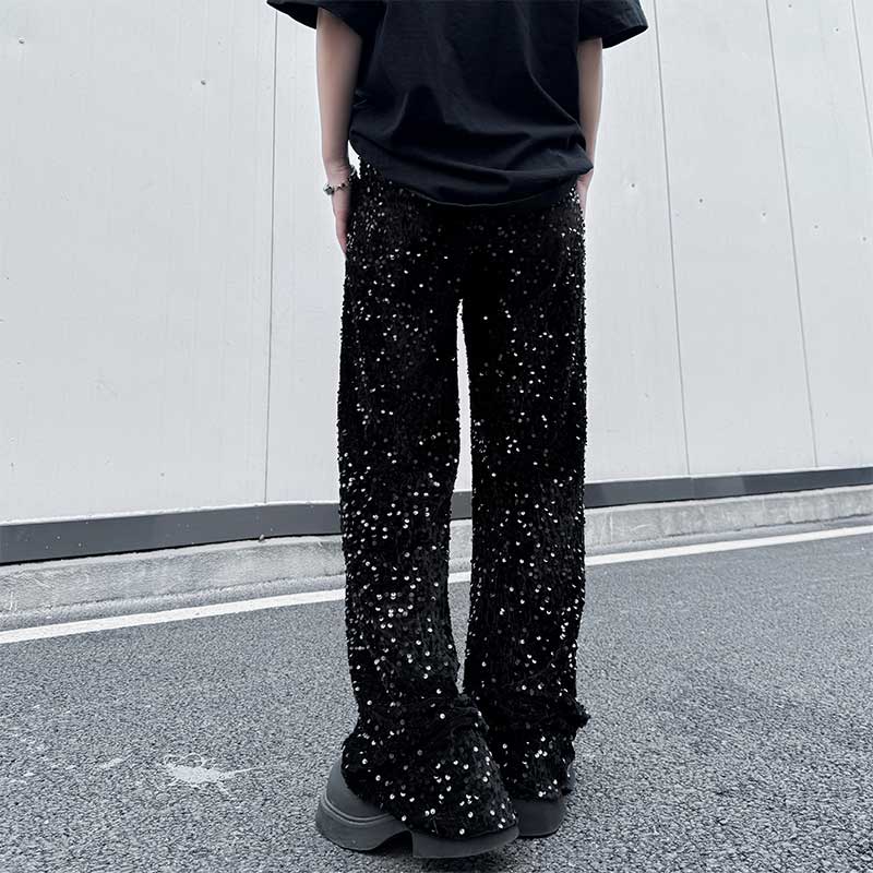 目を惹くスパンコールが輝く、ワイドレッグパンツ。美しいフレアシルエットで、脚長効果も期待できます。パーティーや特別な日の装いにもぴったりですが、普段使いにも活躍します。着るだけでコーディネートが華やかになる、特別な一品です。