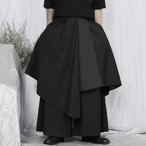 アシンメトリーデザインが際立つワイドパンツ。ミニマルなデザインに、さりげない細かなディテールがアクセントとなり、洗練された印象を与えます。重ねられた生地がつくるドレープは、動きに合わせて美しく揺らめき、着こなしにリズムを生み出します。シンプルながらも個性的なシルエットは、様々なトップスとの組み合わせを楽しめ、デイリーユースから特別な日まで幅広く活躍します。