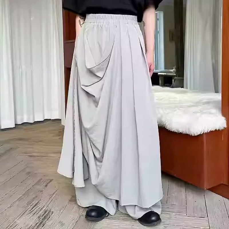 洗練されたアシンメトリーデザインが目を引く、和モダンなワイドパンツ。
