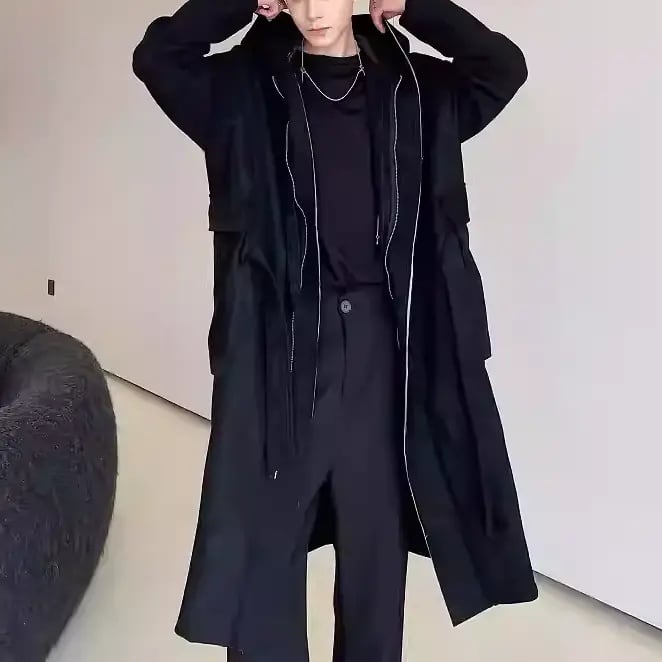 モード感漂うフード付きロングコート。