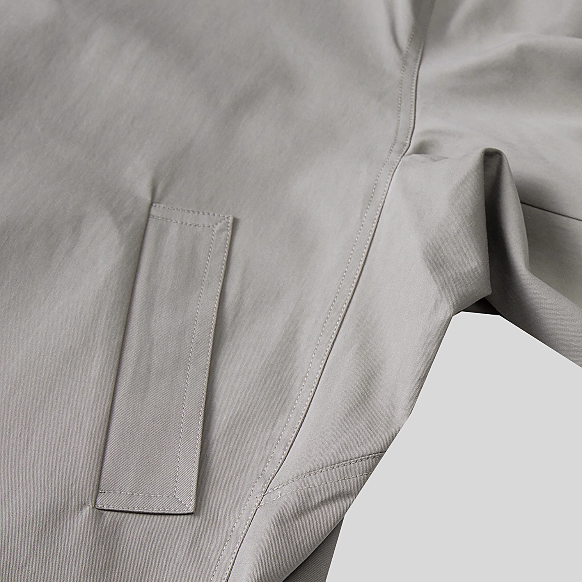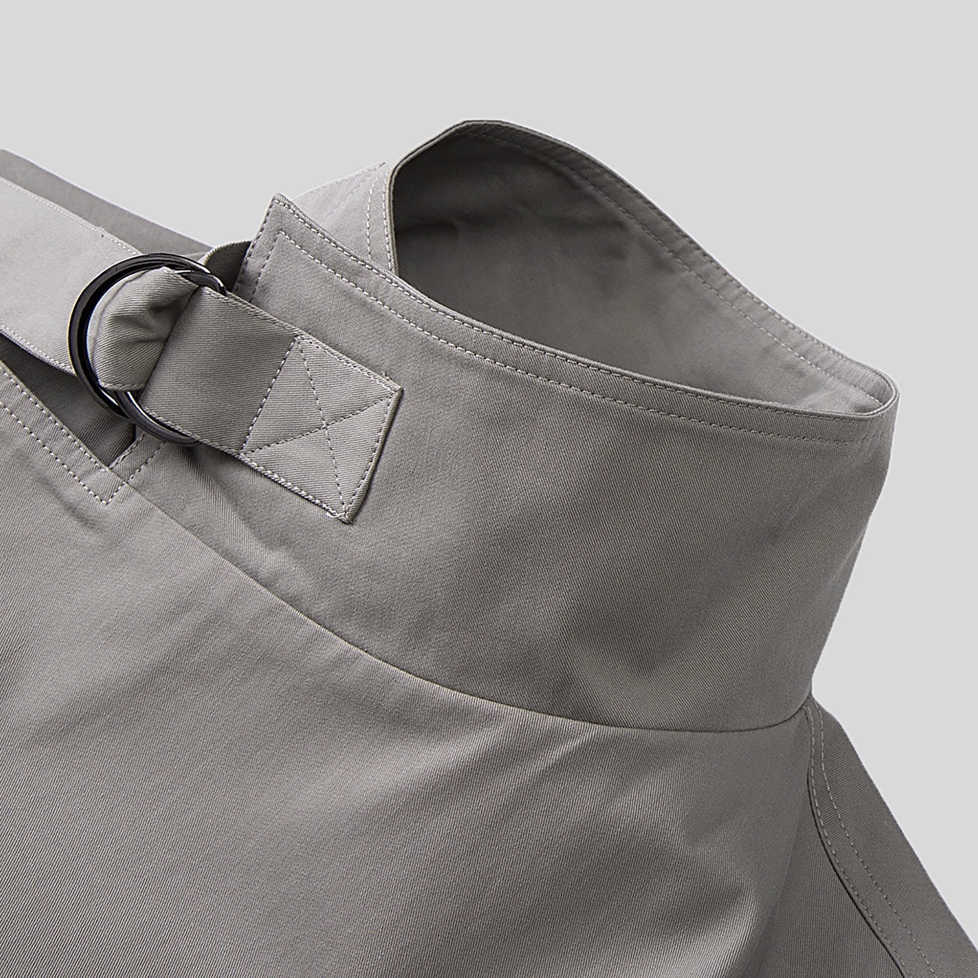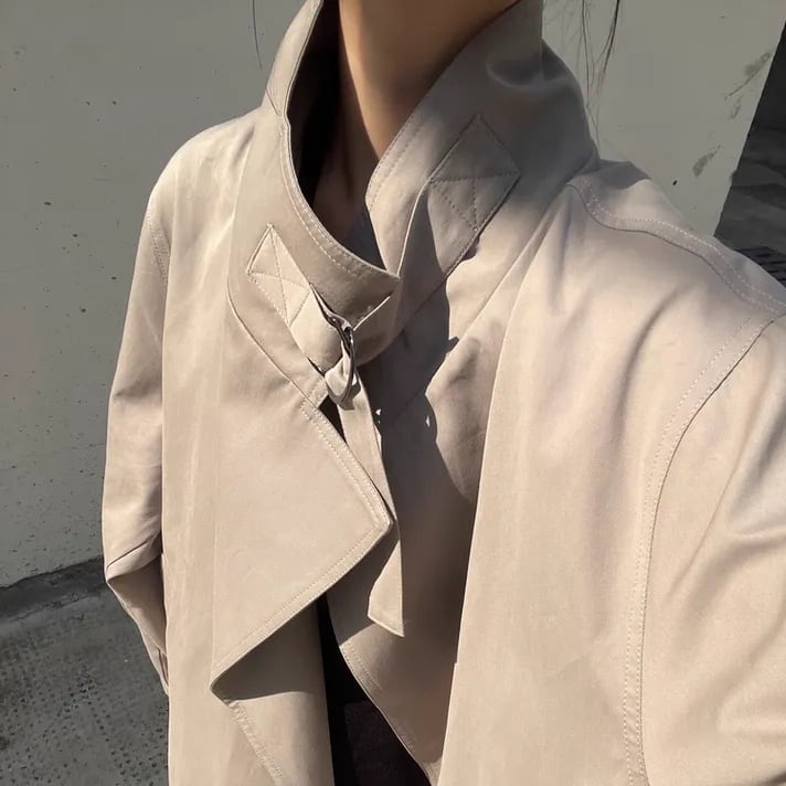 半高襟のディテールがスタイリングに程よいアクセントを加え、羽織るだけでモード感を演出します。