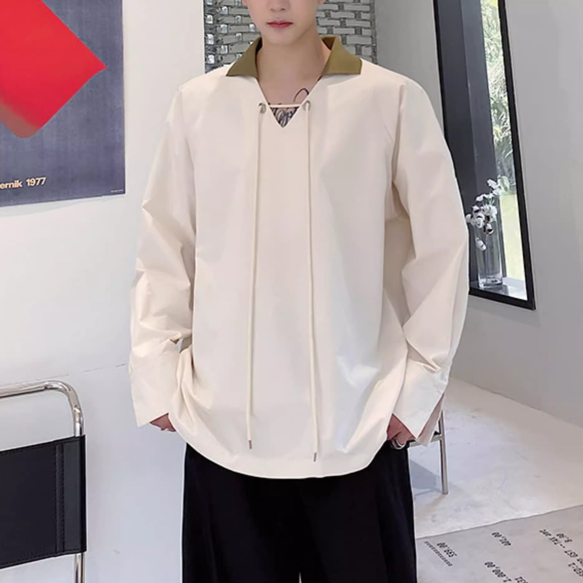 Vネックのドローストリングが特徴的なオーバーサイズシャツ。ミニマルなデザインながら、個性的なディテールが魅力です。ゆったりとしたシルエットは、リラックスした着心地を実現。カジュアルなパンツスタイルから、より洗練されたコーディネートまで、幅広いスタイリングに合わせることができます。