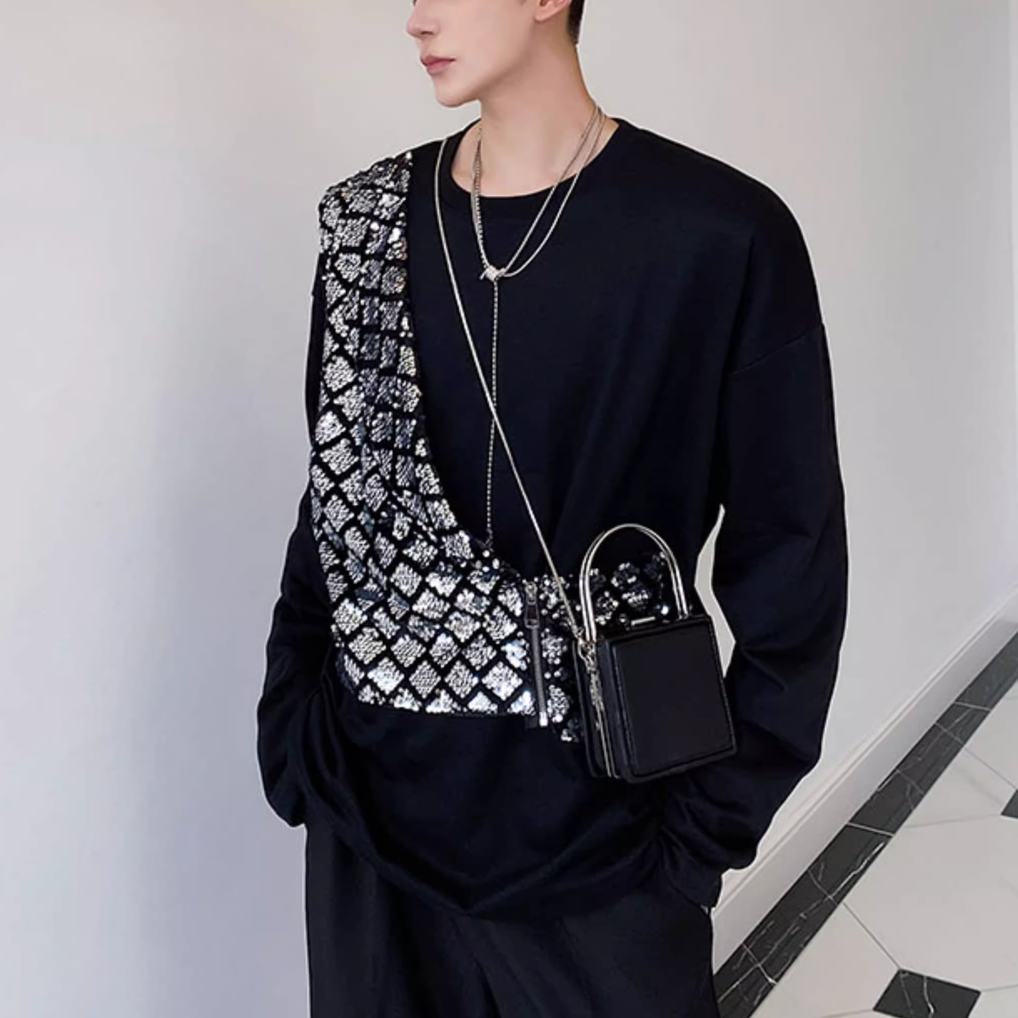 シンプルなブラックのスウェットに、シルバーグリッドの装飾が大胆に施された、モード感あふれる一着です。