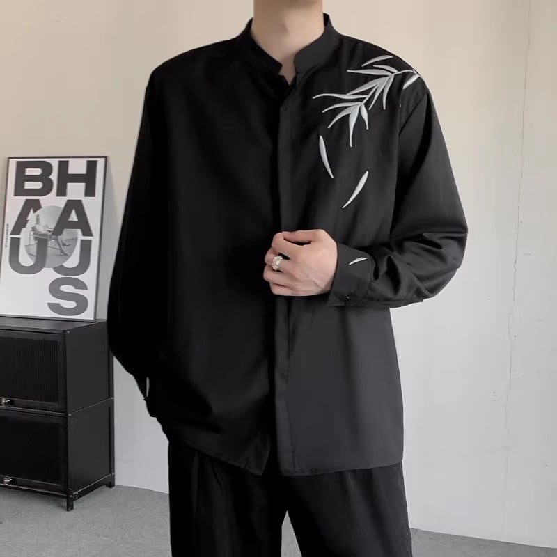 スタンドカラーとさりげない刺繍が、洗練された大人の雰囲気を演出するロングスリーブシャツ。ミニマルなデザインに、枝葉の刺繍がアクセントを加え、着こなしに奥行きを与えます。スラックスと合わせてフォーマルなシーンにも、デニムと合わせてカジュアルダウンしたスタイルにも対応できる汎用性の高さが魅力です。様々なスタイリングで、あなたの個性を際立たせてください。