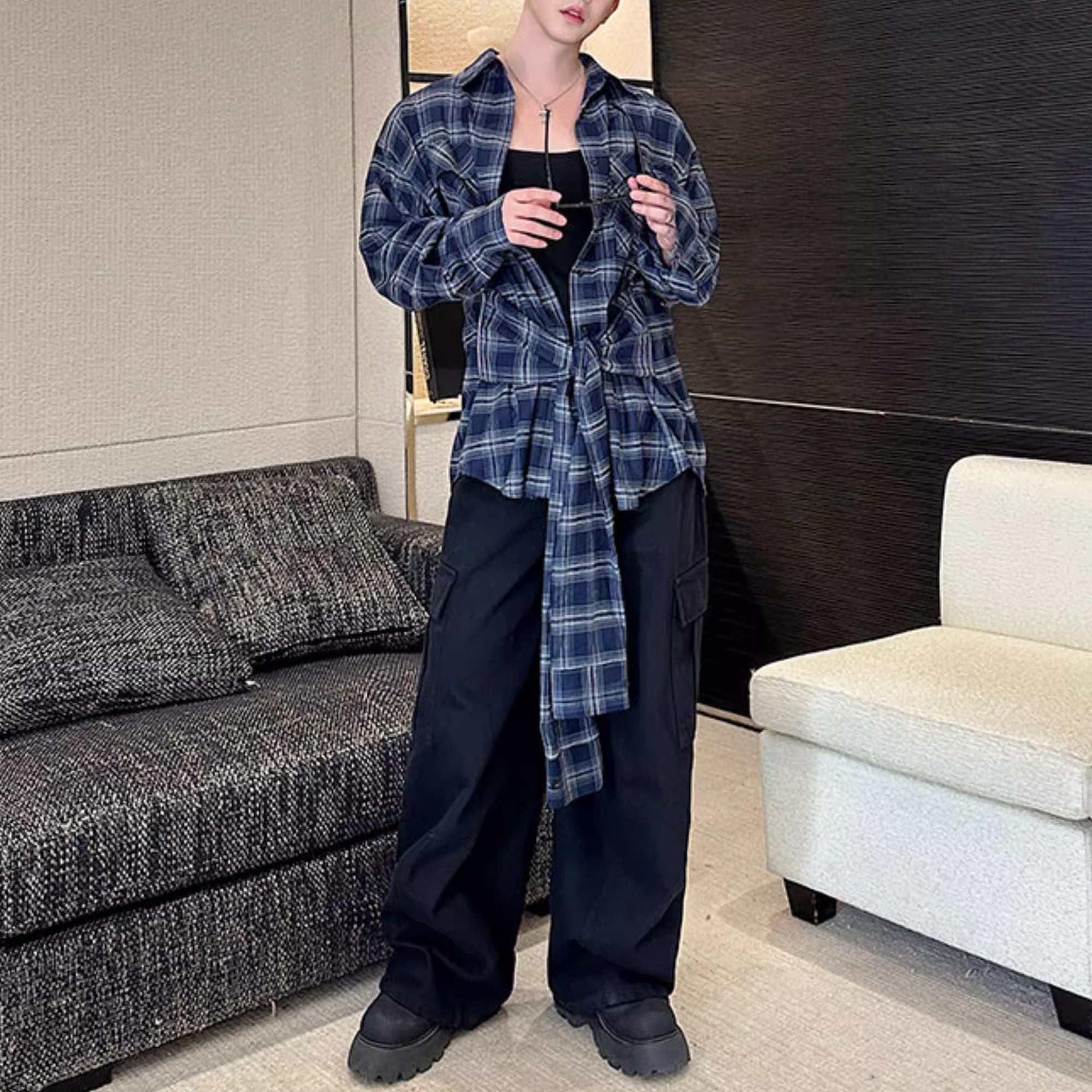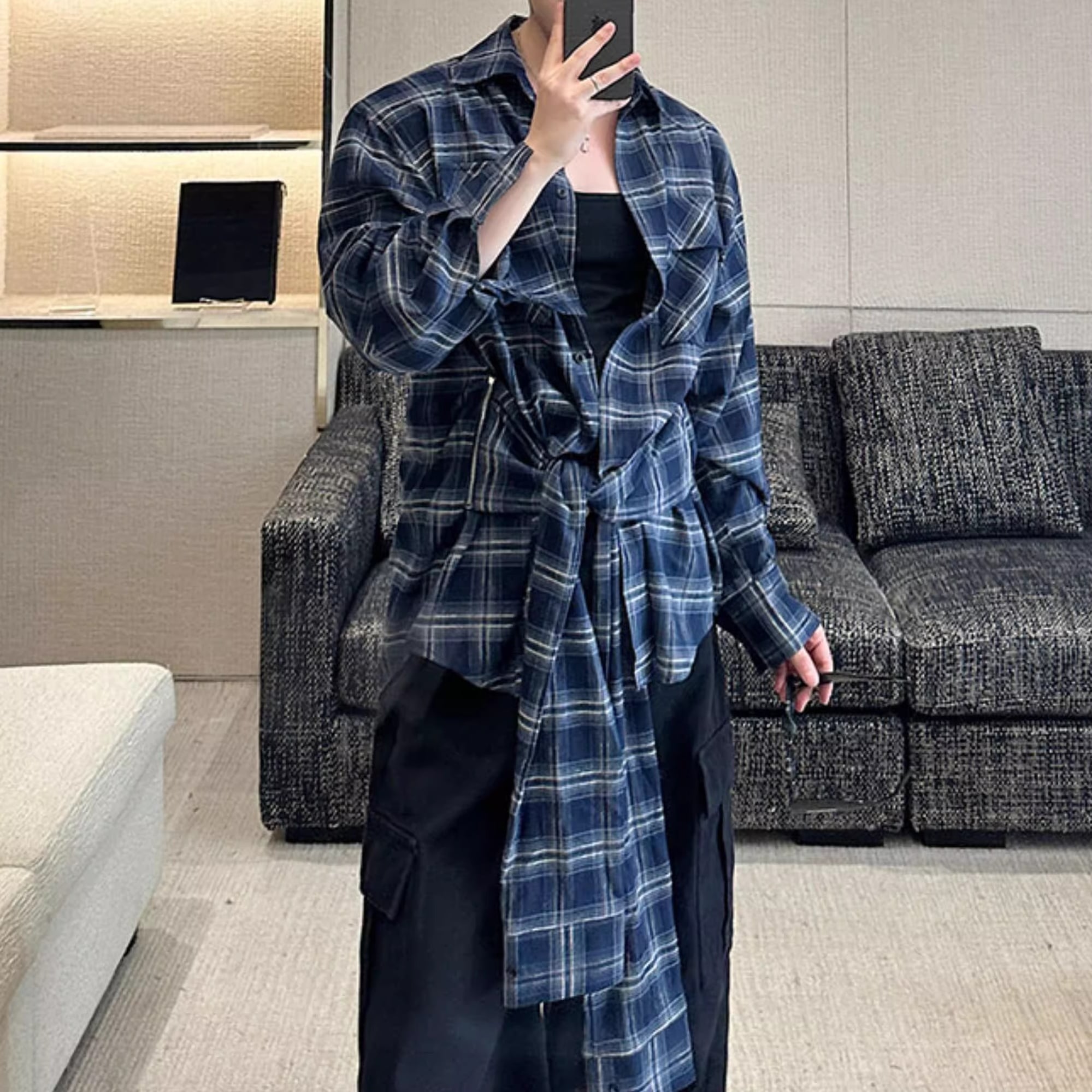 チェック柄オーバーサイズロングシャツ 腰紐付き 1color MTO0362