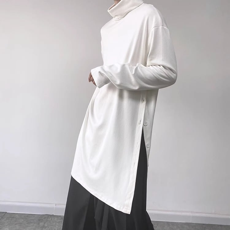 サイドスリットとボタンがアクセントになったロングタートルネックトップス。ミニマルなデザインながら、サイドのスリットとボタンがさりげない個性を演出します。ロング丈で、様々なボトムスとの組み合わせを楽しめます。シンプルながらも存在感のあるアイテムで、洗練されたスタイルを完成させましょう。