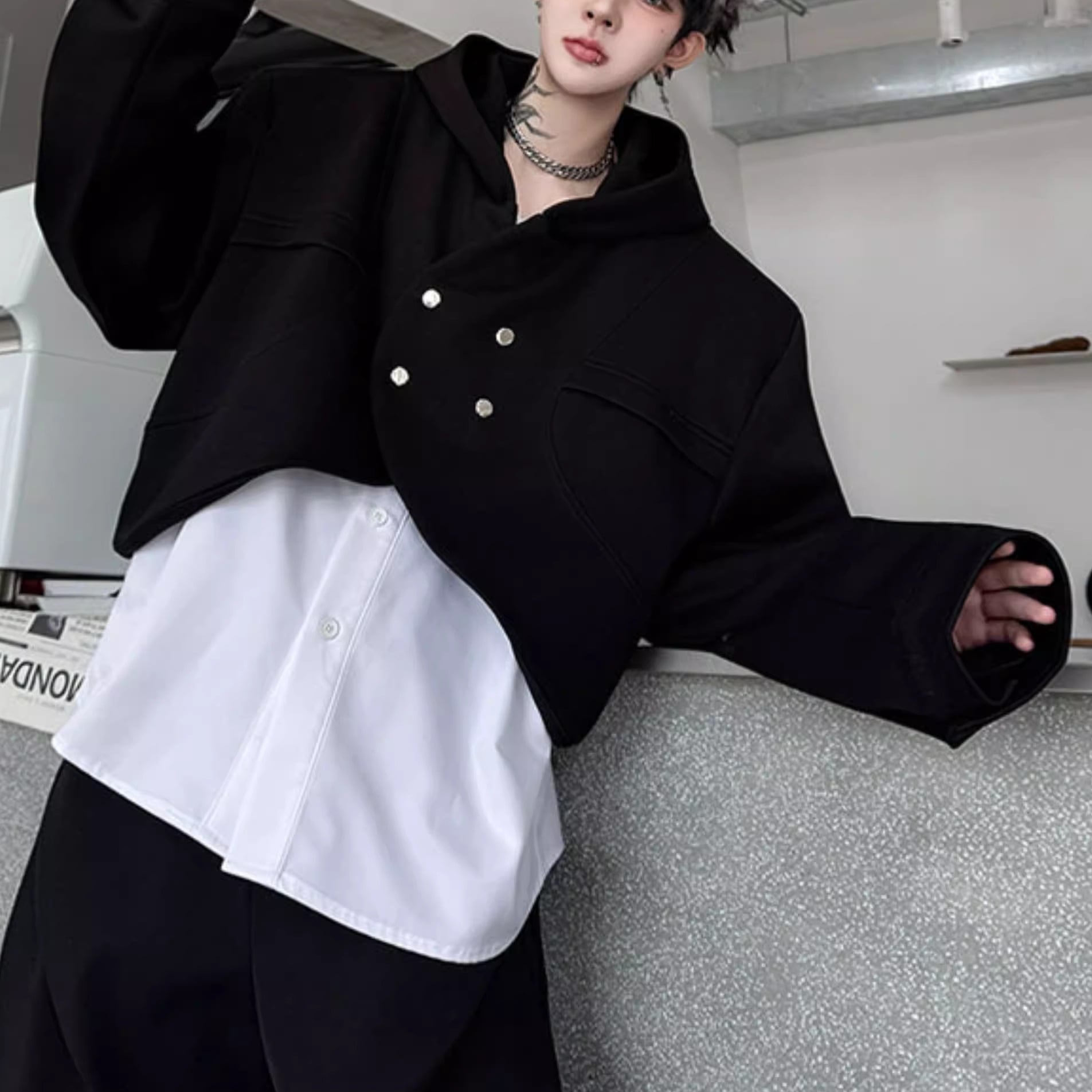 オーバーサイズシルエットとダブルブレストデザインが特徴的なフーディーです。