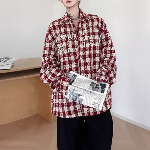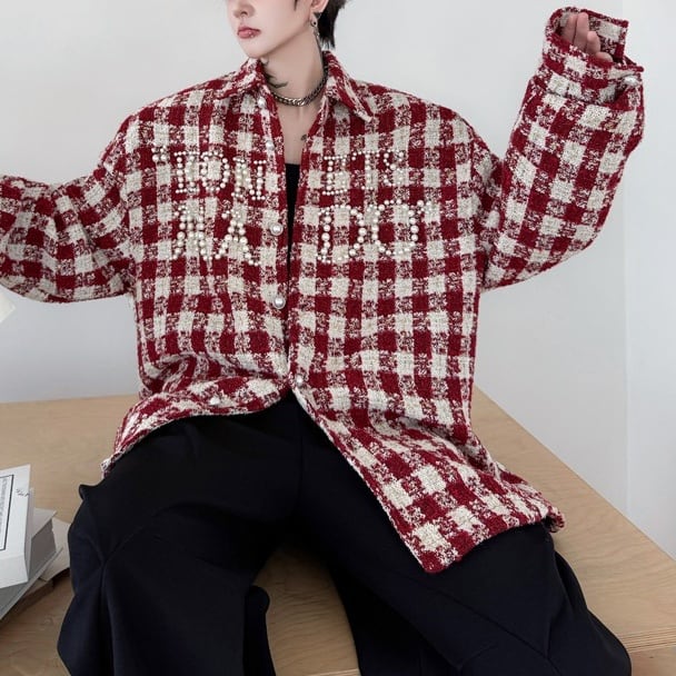 チェック柄とパール装飾が絶妙なバランスで融合した、オーバーサイズロングスリーブシャツ。