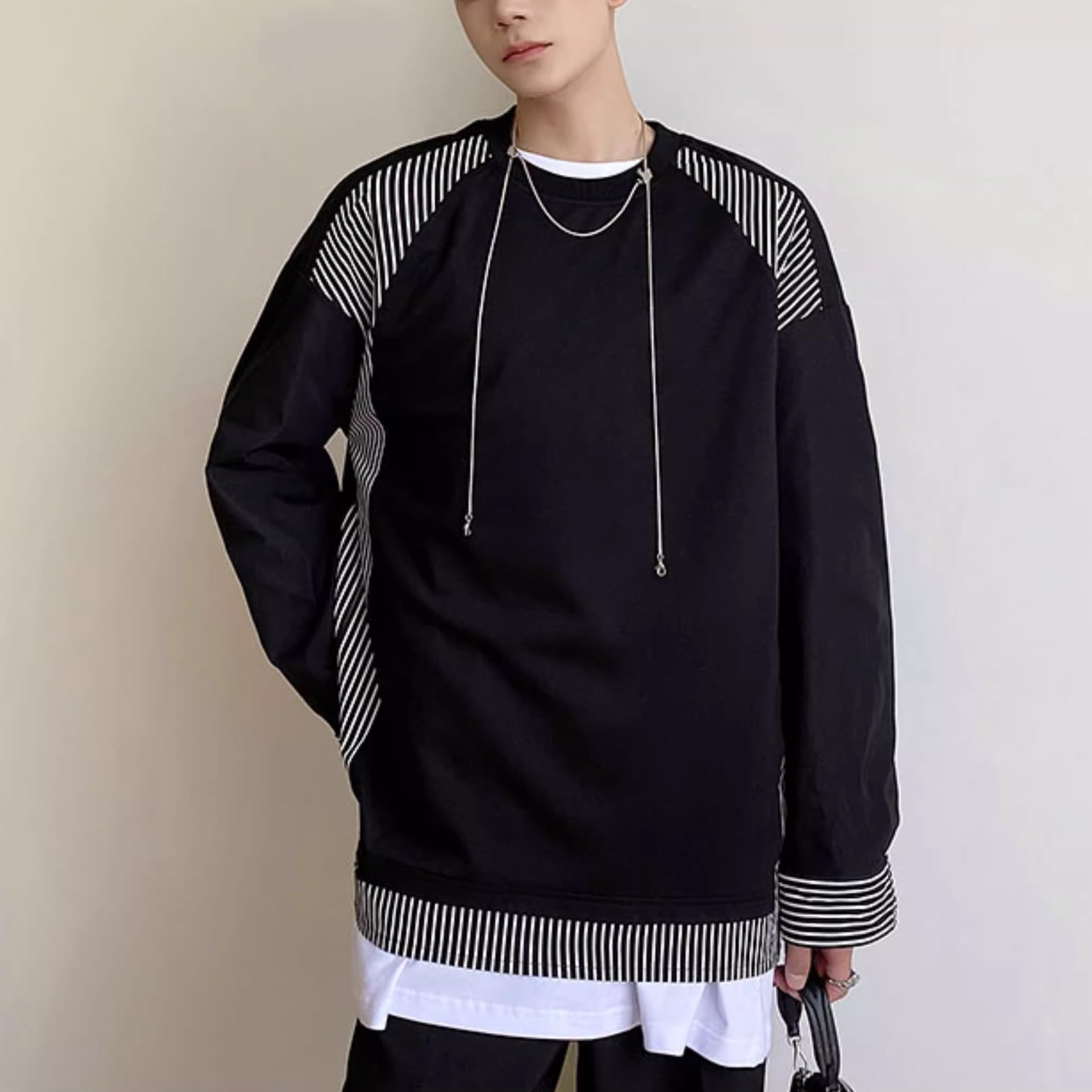 ストライプ切替が目を惹く、オーバーサイズのプルオーバー。ミニマルなデザインに、さりげなく効かせたストライプが洗練された印象を与えます。ゆったりとしたシルエットでリラックスした着心地を実現しながら、スタイリッシュな雰囲気も演出。カジュアルなパンツスタイルから、きれいめなコーディネートまで幅広く活躍します。