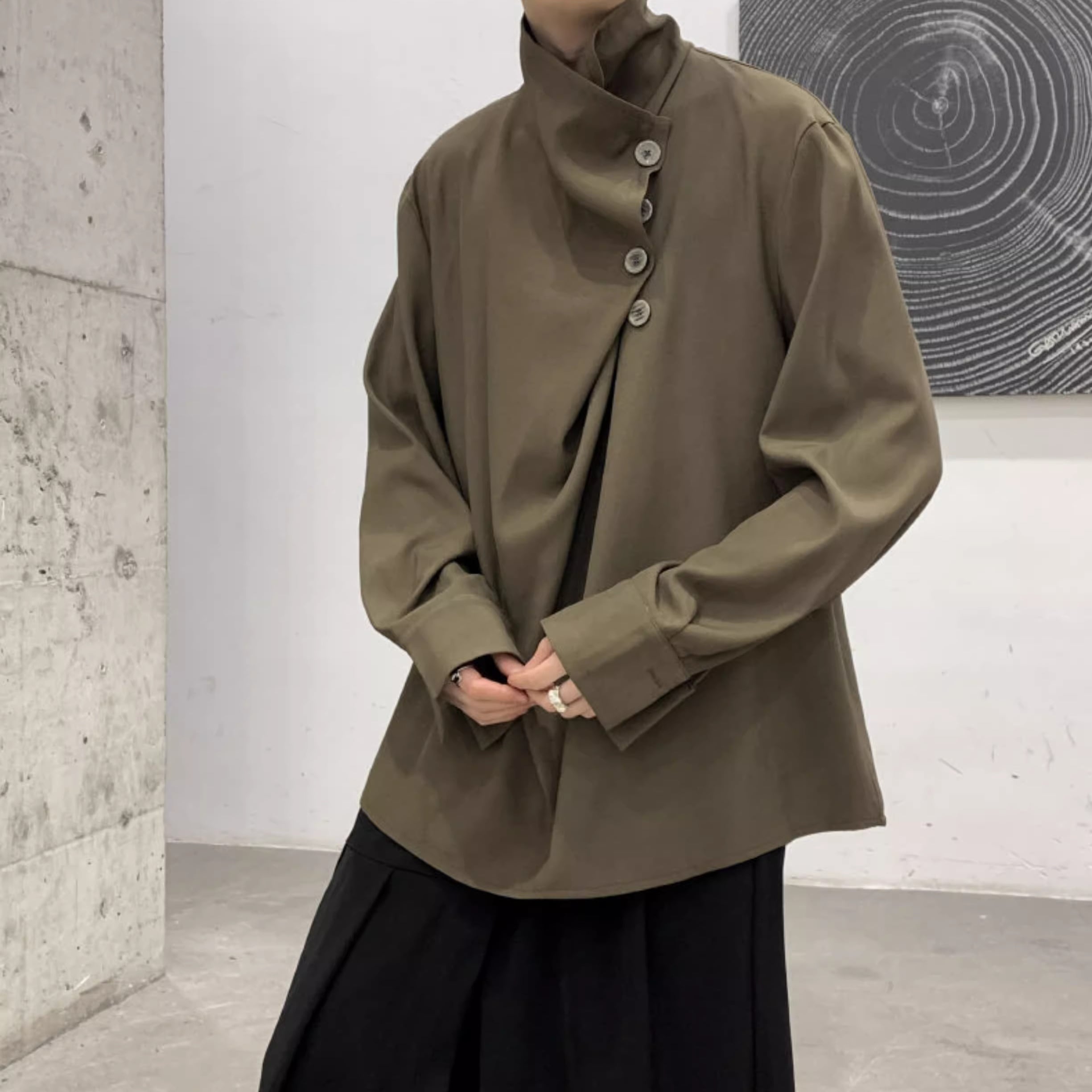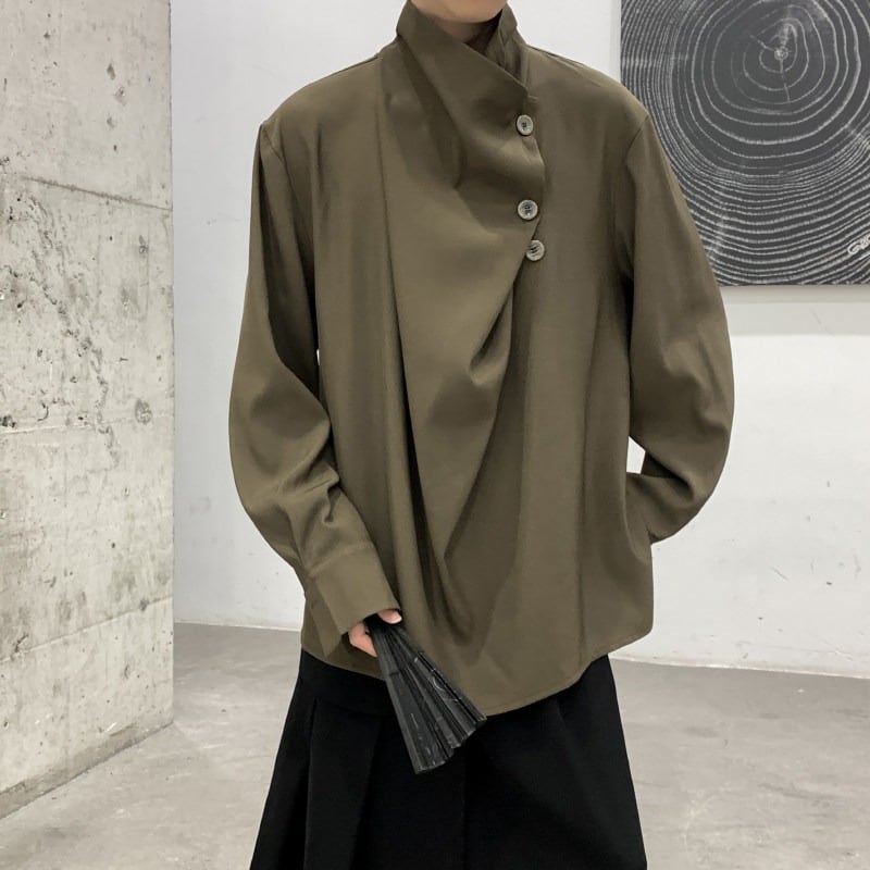 スタンドカラーアシンメトリーボタンドレープシャツ 2color MTO0397