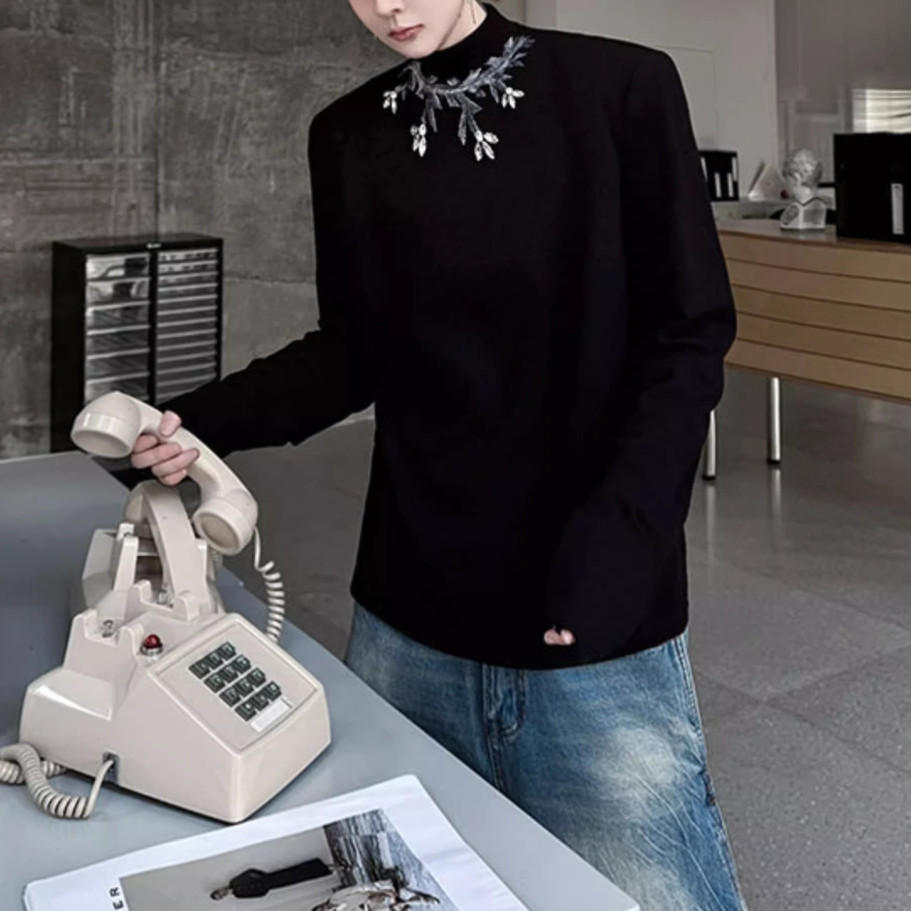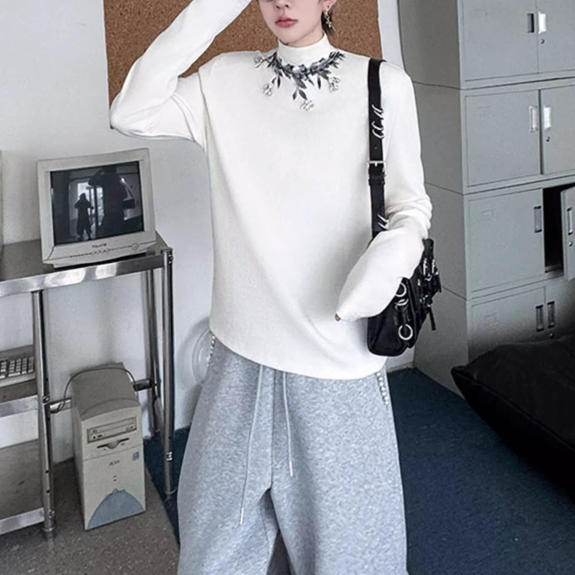 ハイネックのデザインにリーフモチーフの装飾が施された、洗練されたプルオーバー。ミニマルなデザインでありながら、首元の装飾が個性を際立たせ、シンプルながらも存在感のある着こなしを叶えます。様々なボトムスと合わせやすく、デイリーユースから特別な日まで幅広く活躍します。