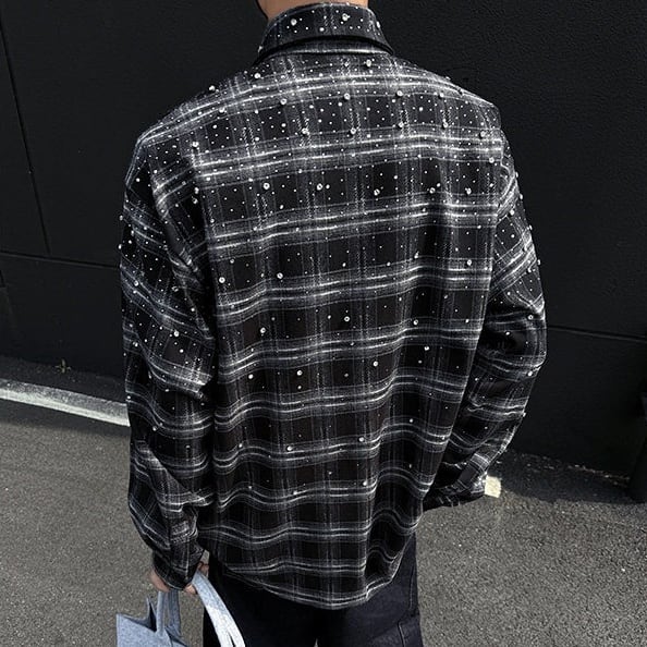 チェック柄と輝く装飾が印象的なオーバーシャツ。