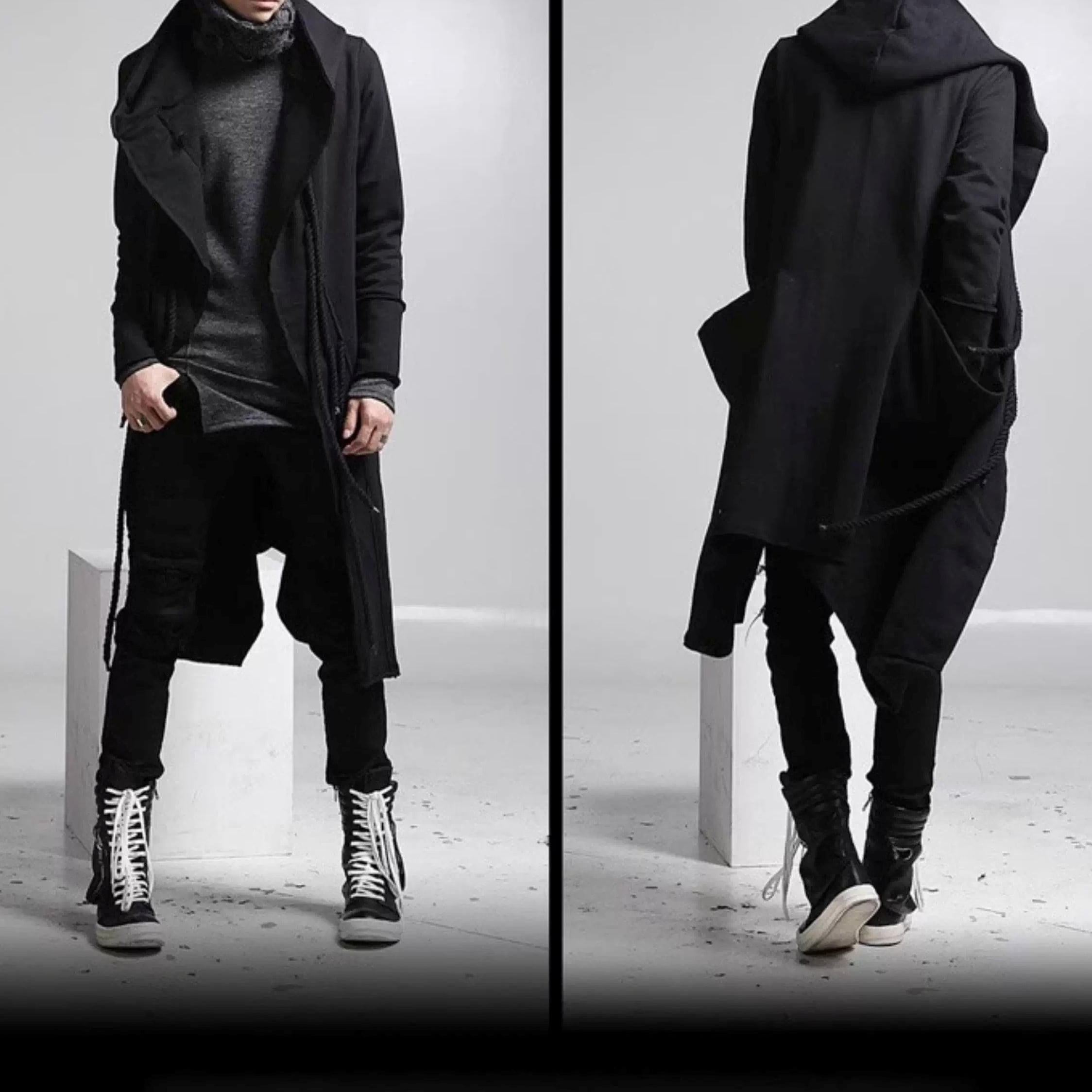 ロング丈でドロップショルダー、スリット入りのフード付きコート。