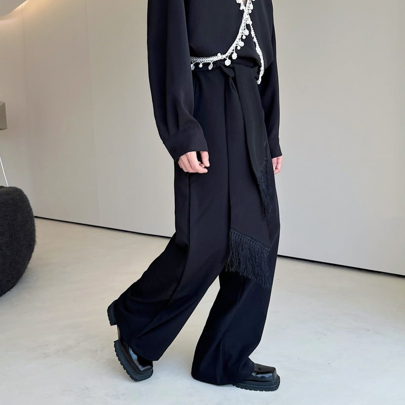 フリンジディテールが目を惹くラップパンツ。ミニマルなデザインに、存在感抜群のフリンジがアクセントを加え、シンプルなスタイルをワンランクアップさせます。ウエストのリボンで調整可能なラップデザインは着こなしの幅を広げ、様々なトップスと相性抜群。オフィスシーンからカジュアルなスタイルまで、幅広いコーディネートで活躍します。