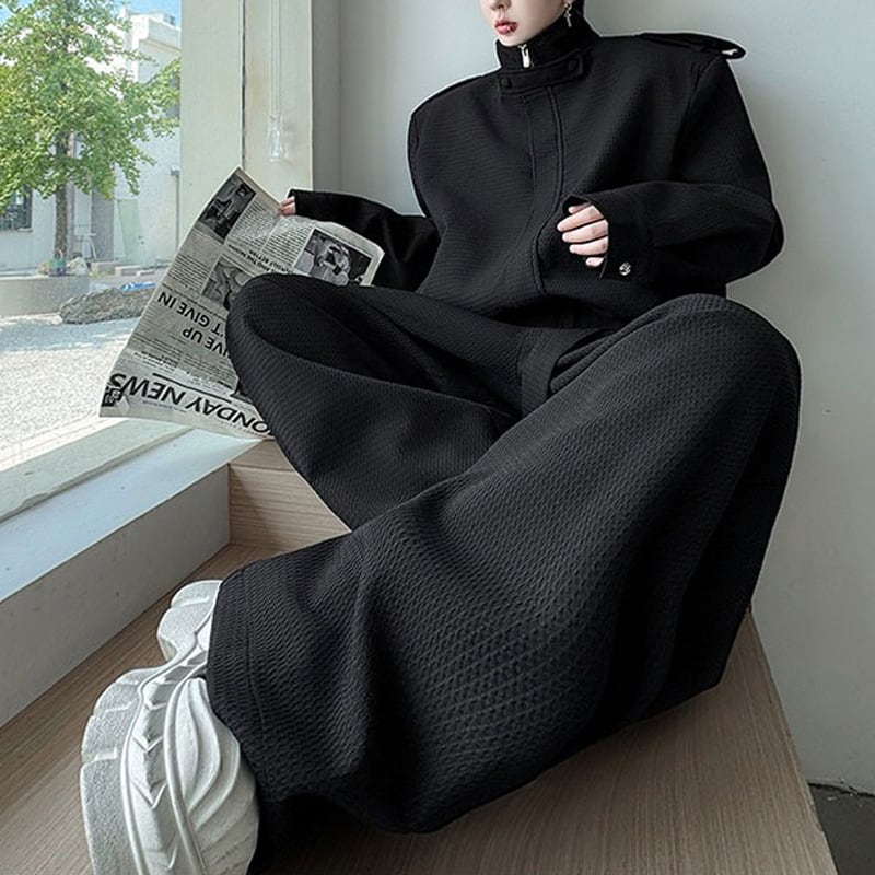 スタンドカラーとジップアップデザインが洗練された雰囲気を演出するセットアップ。