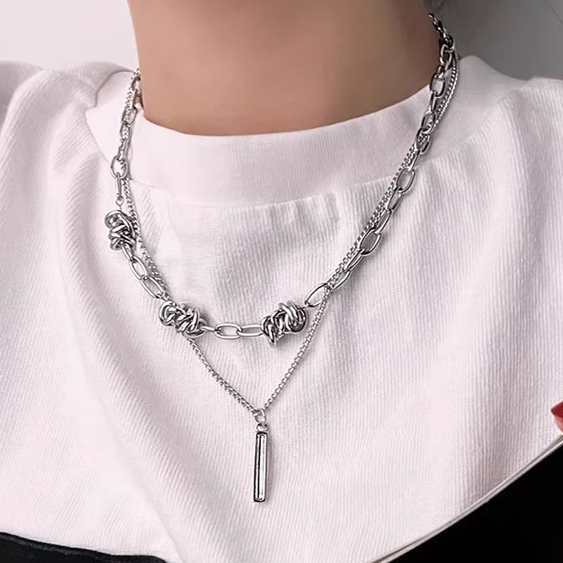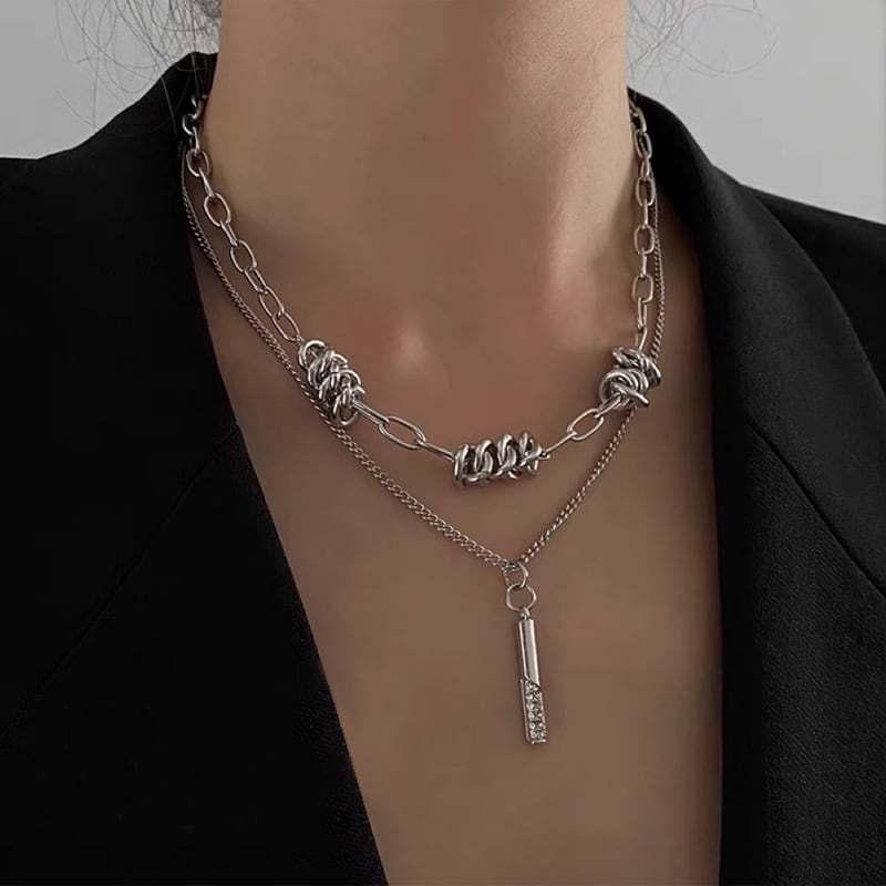 重なり合うチェーンの異なるデザインが、首元に立体感と奥行きを与えます。