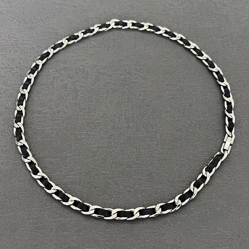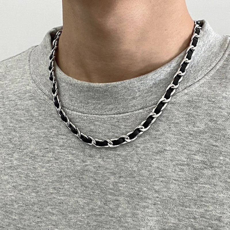 レザーとメタルの組み合わせが洗練された印象を与えるネックレス。