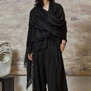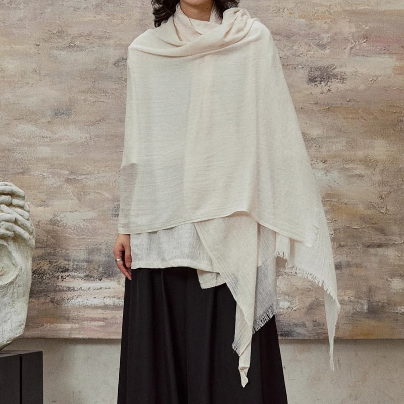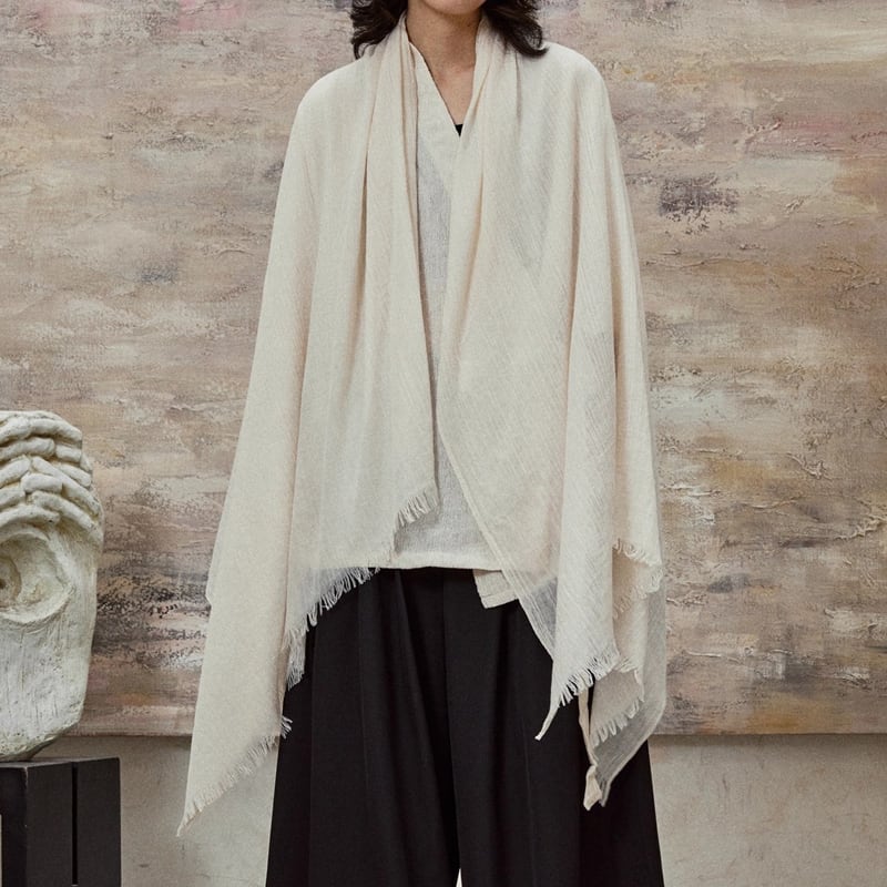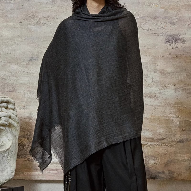 ロング丈のフリンジが特徴的な、アシンメトリーデザインのストール。