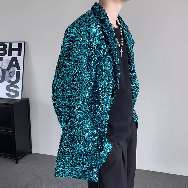 スパンコールが光を反射し、華やかな印象を与える長袖ジャケット。