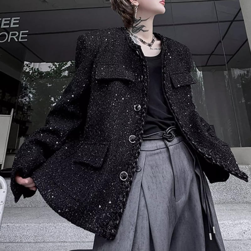 首元をすっきり見せるノーカラーデザインで、インナーを選ばず様々なスタイルに合わせやすいジャケットです。