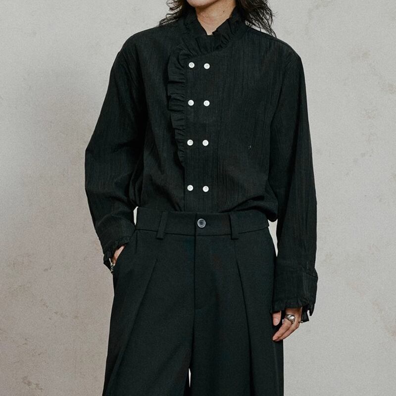 胸元のフリルとダブルブレストがアクセントとなり、スタイリングに深みを与えます。