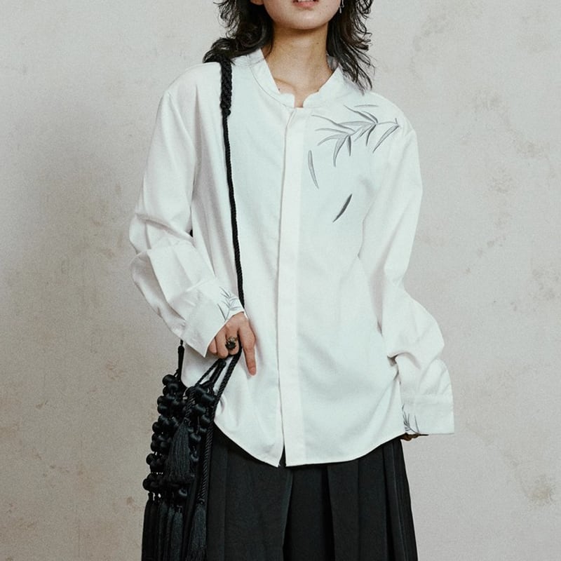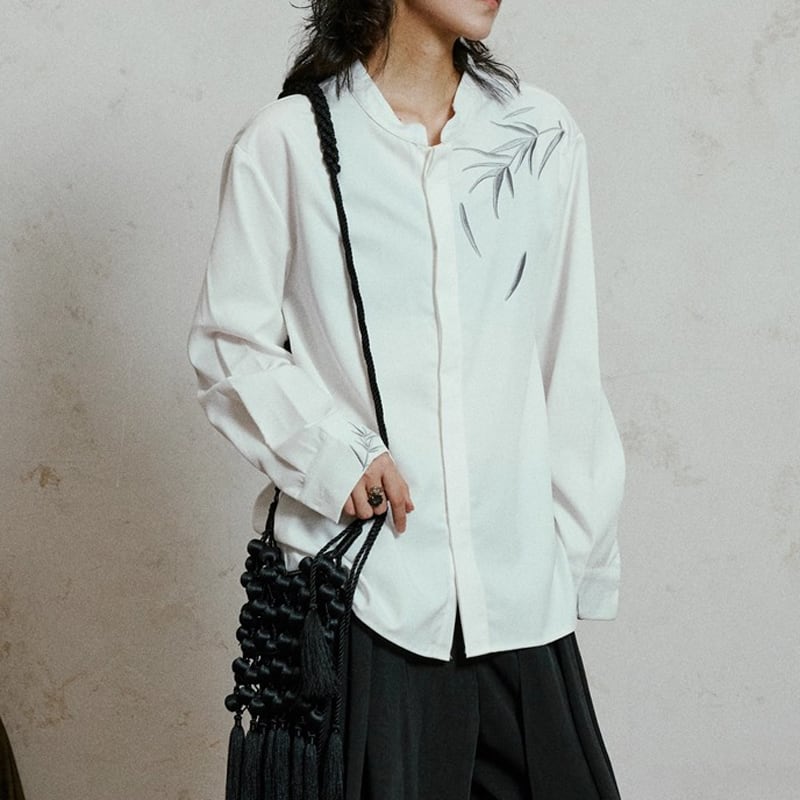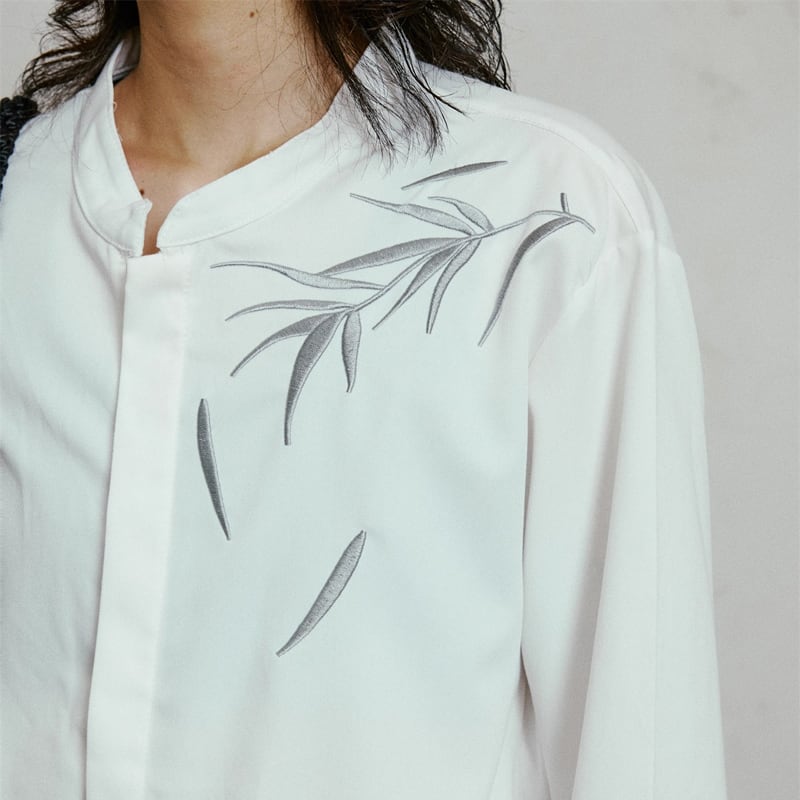装飾が印象的な長袖レギュラー丈シャツ。