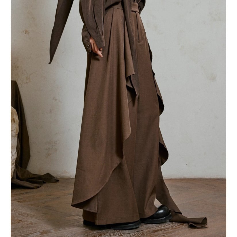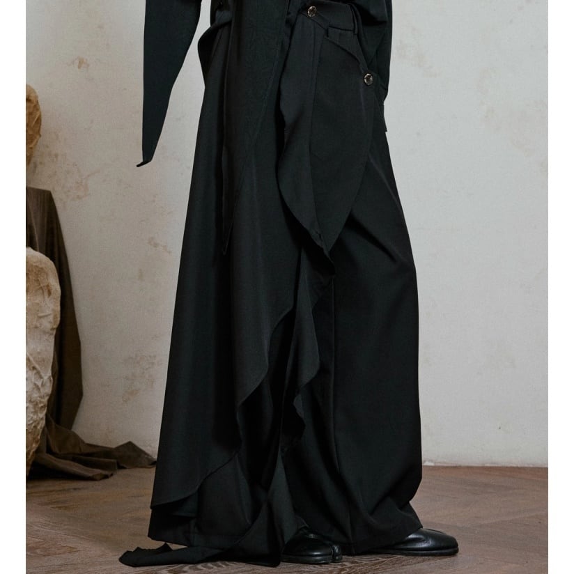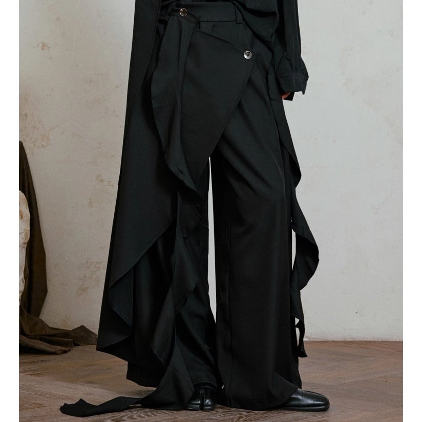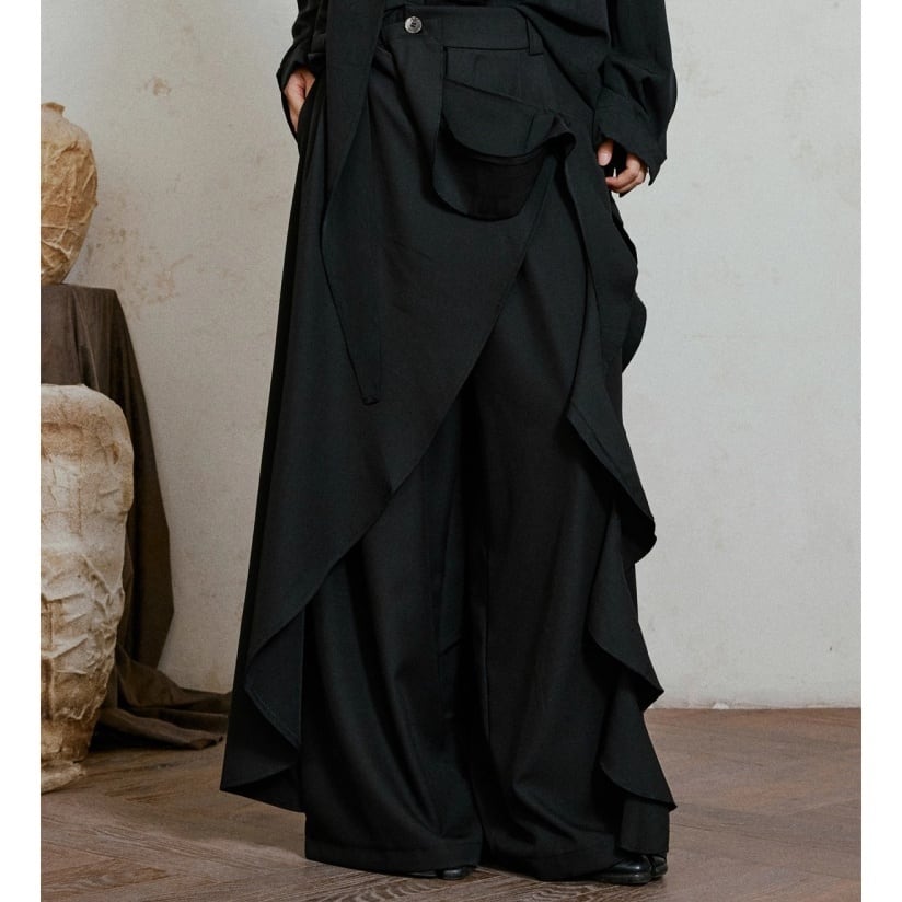 アシンメトリーなラップデザインが目を引く、マキシ丈ワイドパンツ。