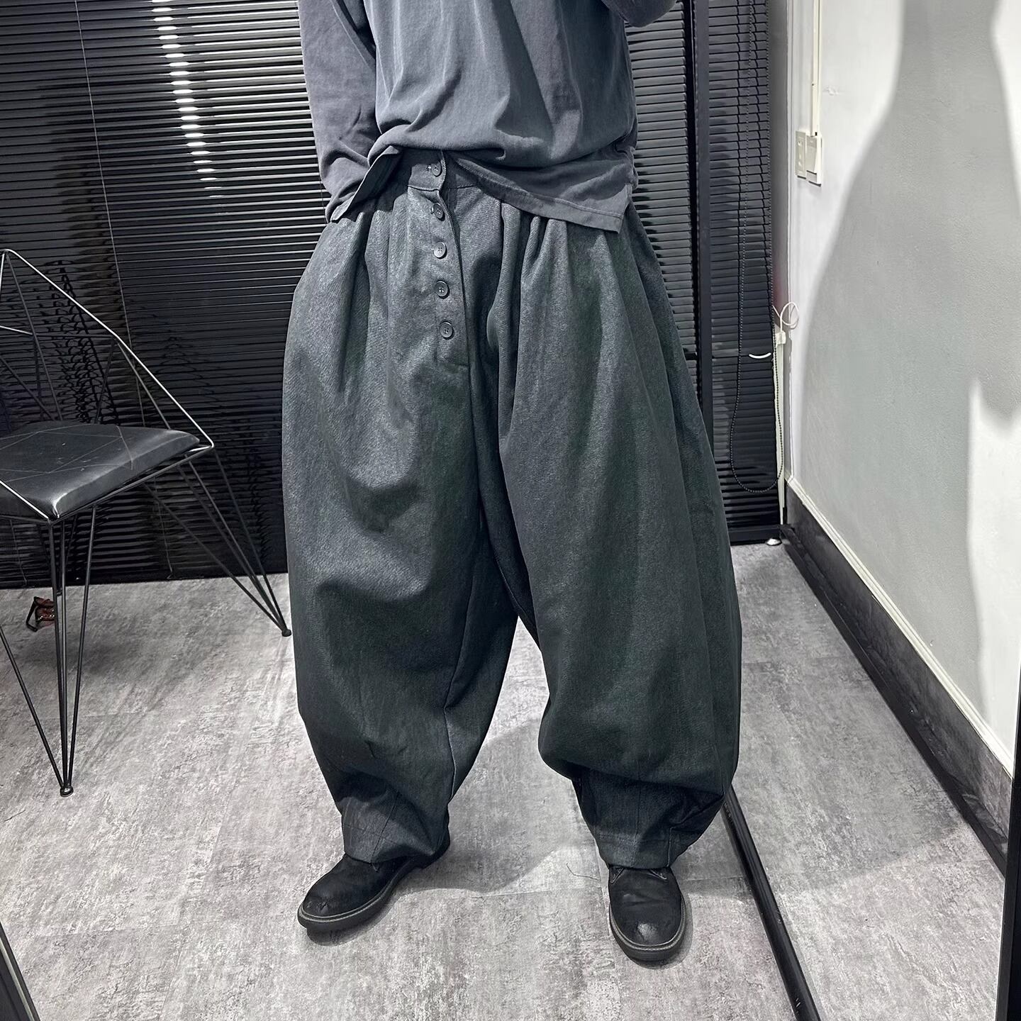 フロントボタンが特徴的な、ワイドシルエットのテーパードパンツ。