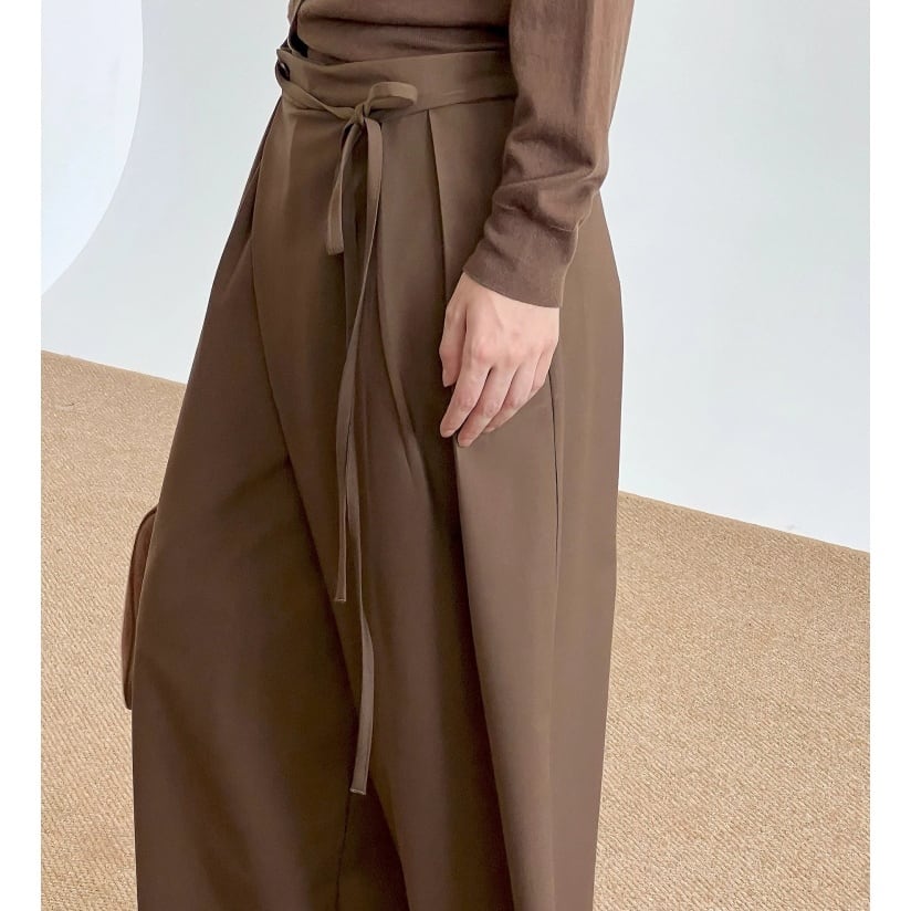 モダンなシルエットが目を引くワイドパンツ。ウエストのラップデザインとベルトが、スタイリングにさりげない個性をプラスします。ゆったりとしたシルエットはリラックスした着心地で、普段使いはもちろん、お出かけにも最適です。シンプルなトップスと合わせるだけで、こなれ感のあるスタイリングが完成します。