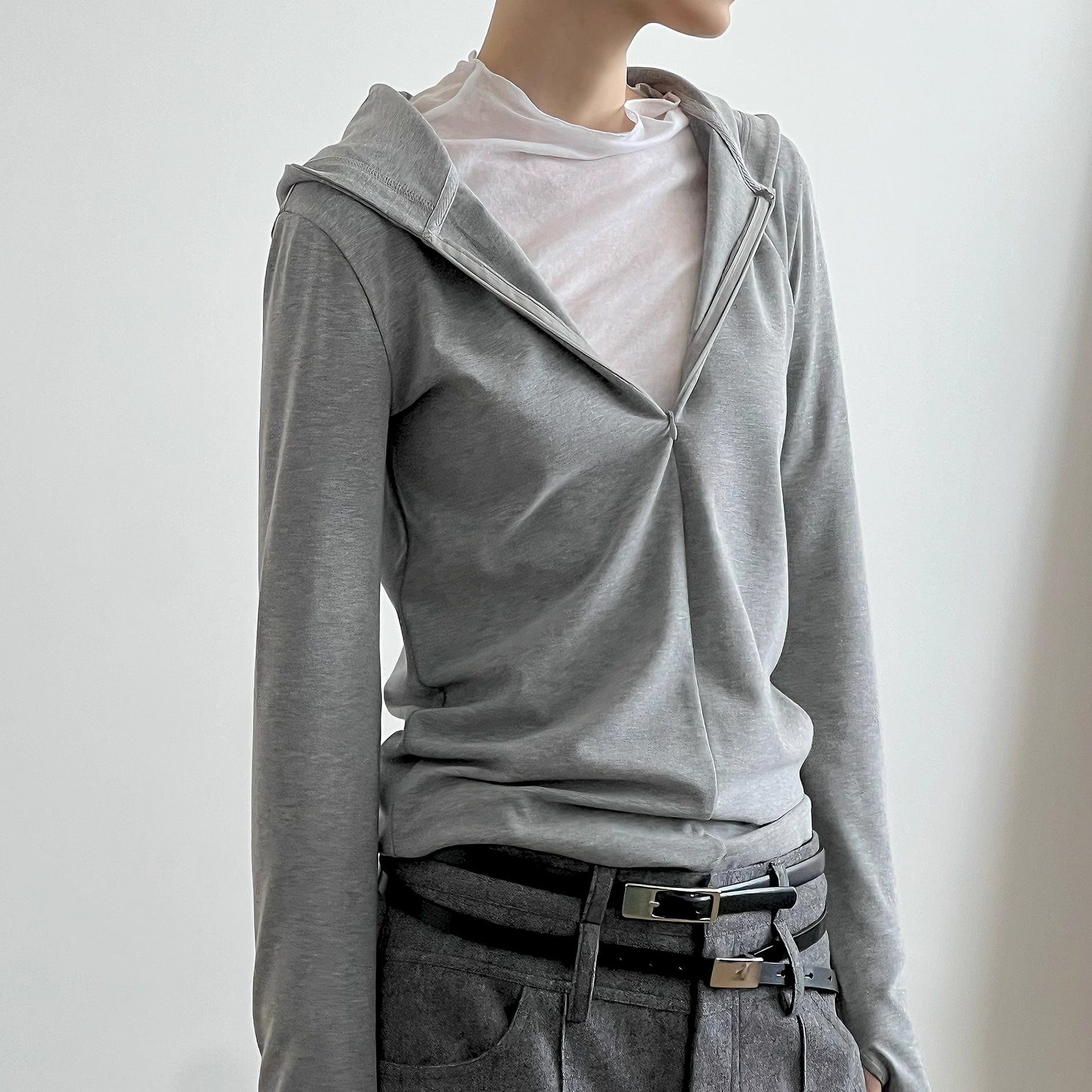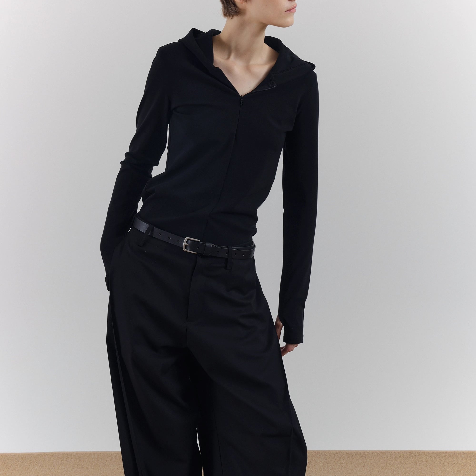 ジップの開閉で印象を変えられる、カジュアルながらも洗練された印象を与えてくれるフーディ。