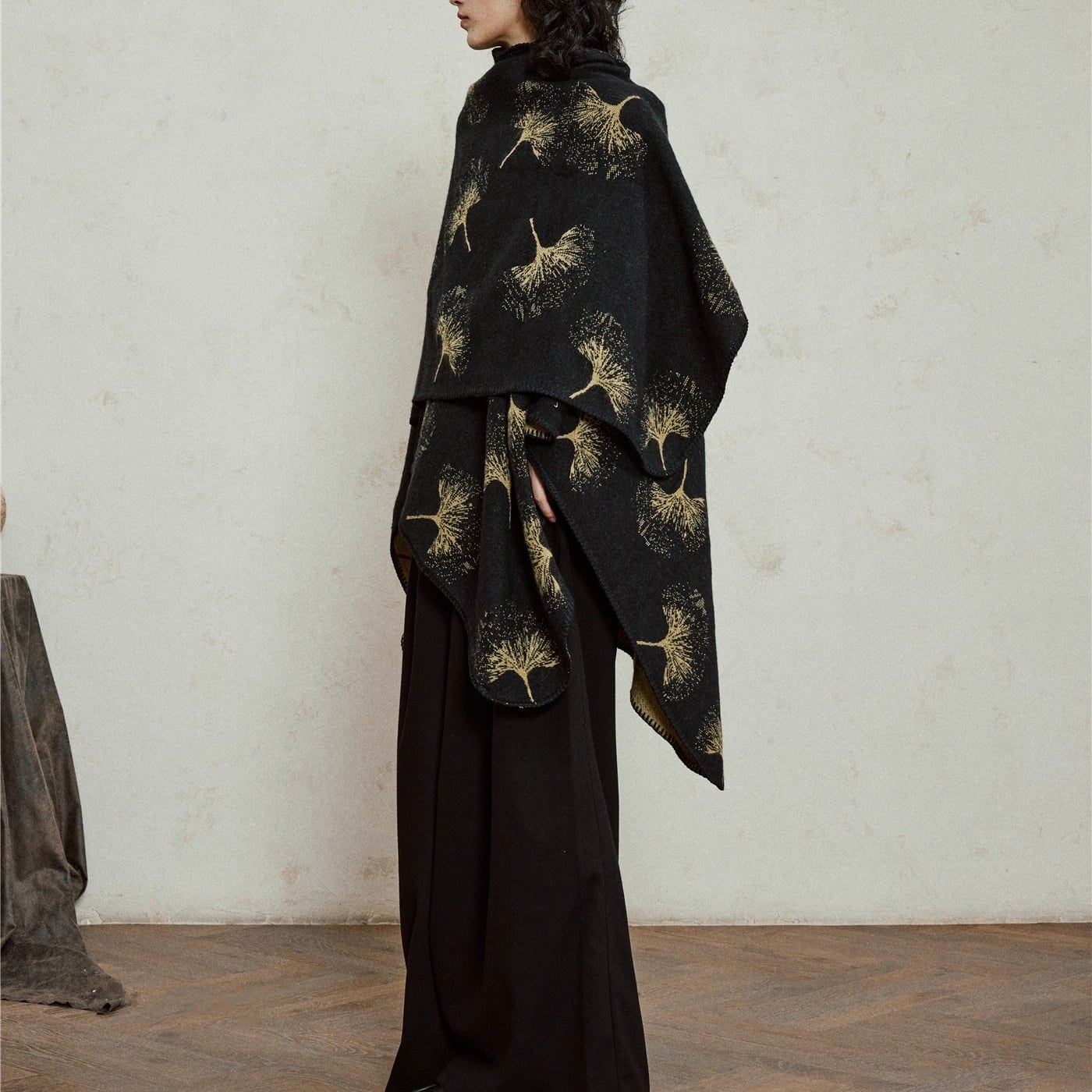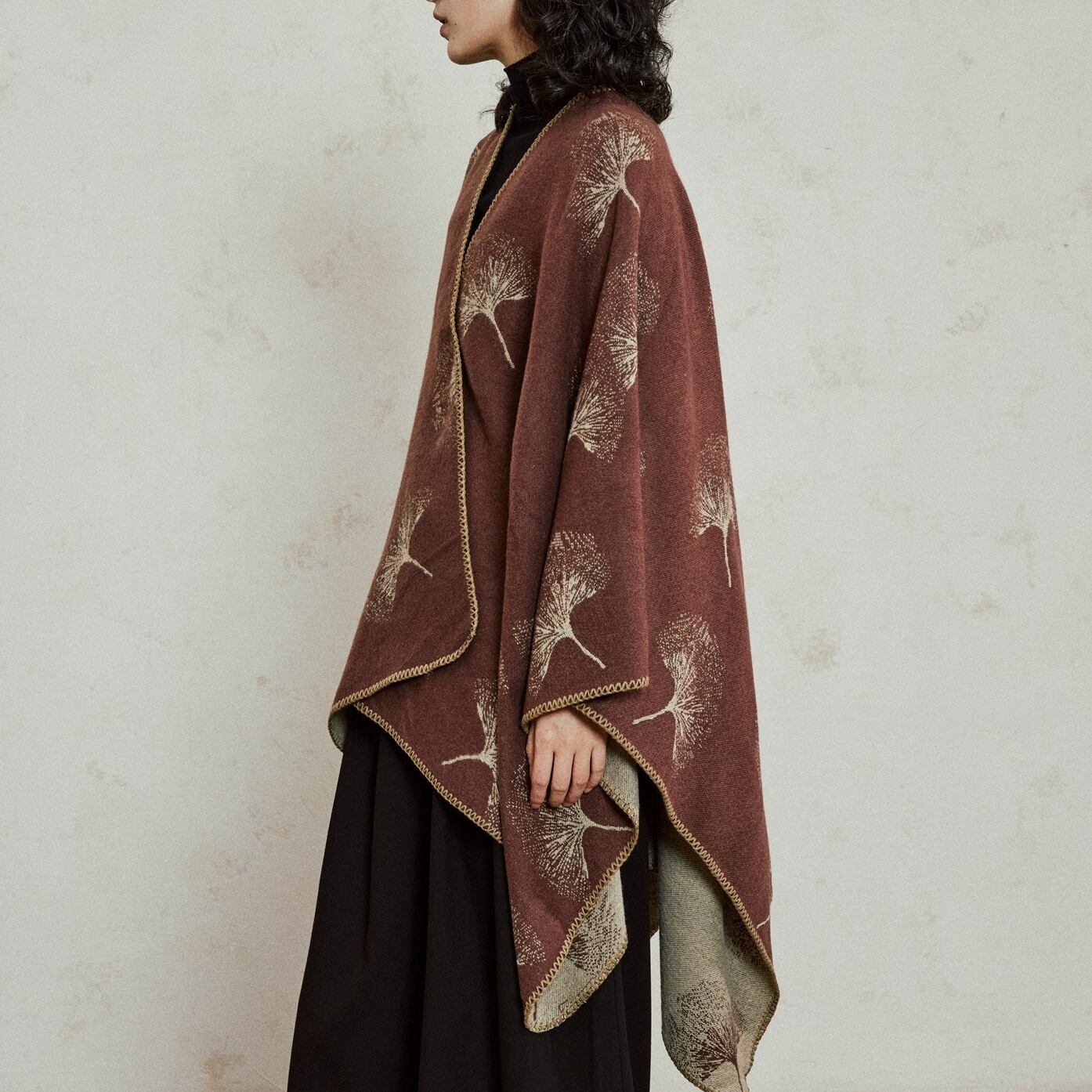 目を引くジャカード織のポンチョは、普段の装いにエレガントな雰囲気をプラスします。シンプルなデザインでありながら、印象的な柄が個性を引き立て、洗練されたスタイルを演出。落ち着いた色合いは、様々なコーディネートに合わせやすく、デイリーユースにも最適です。