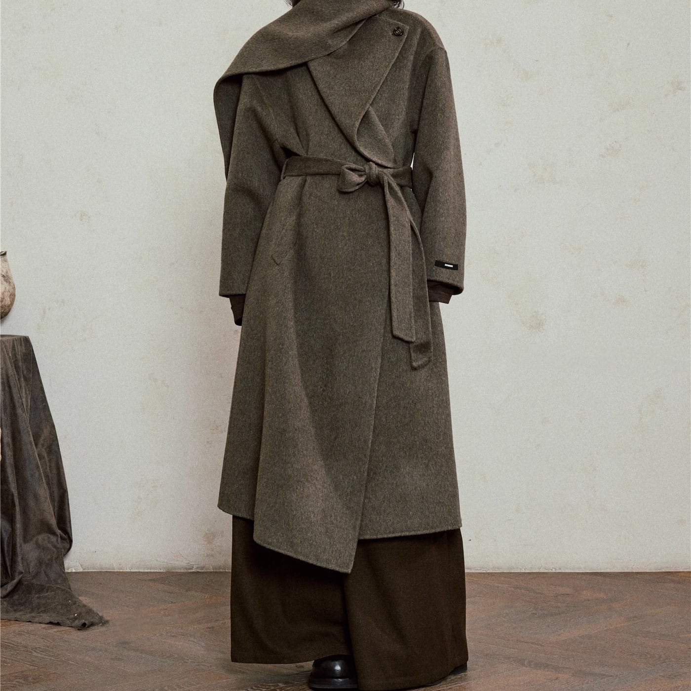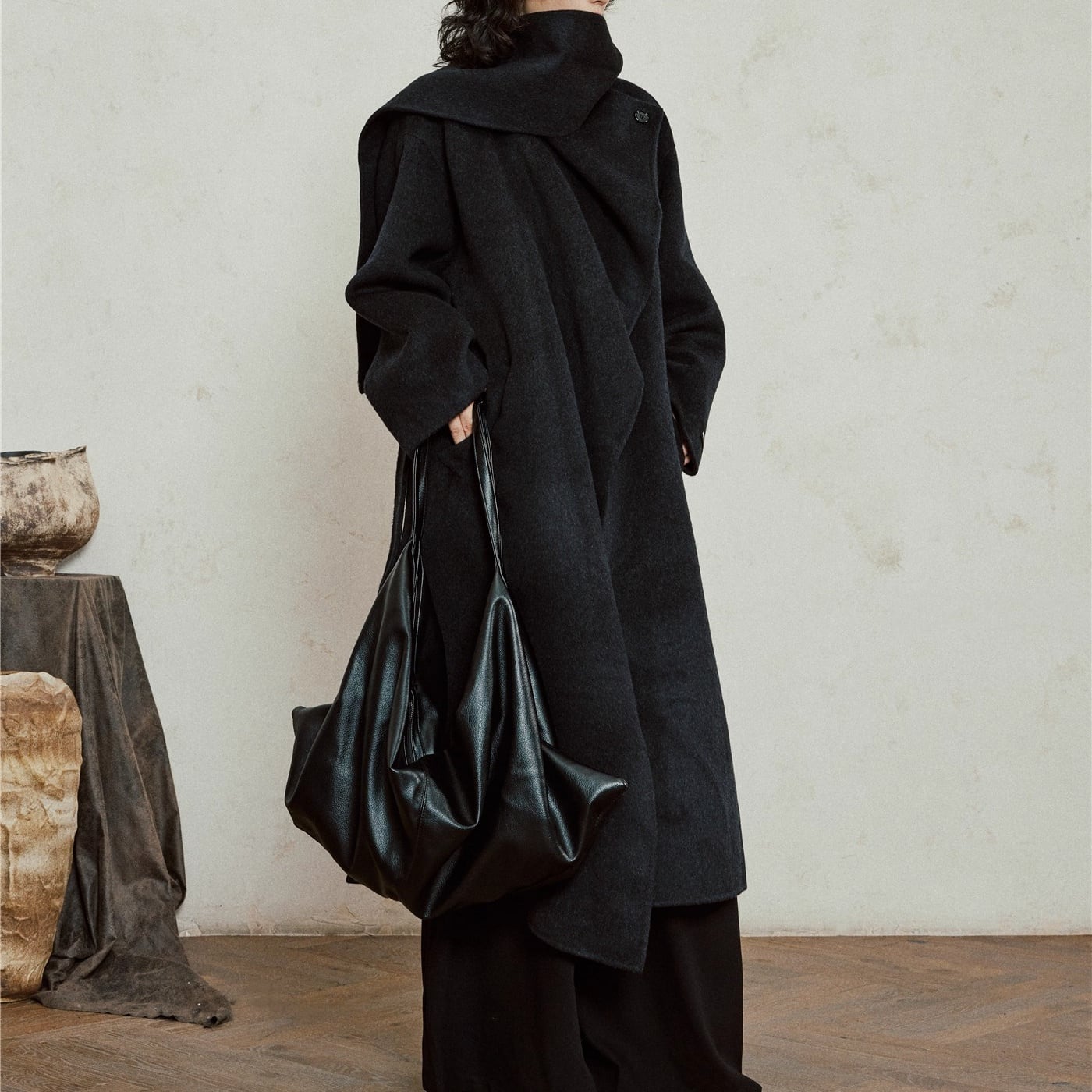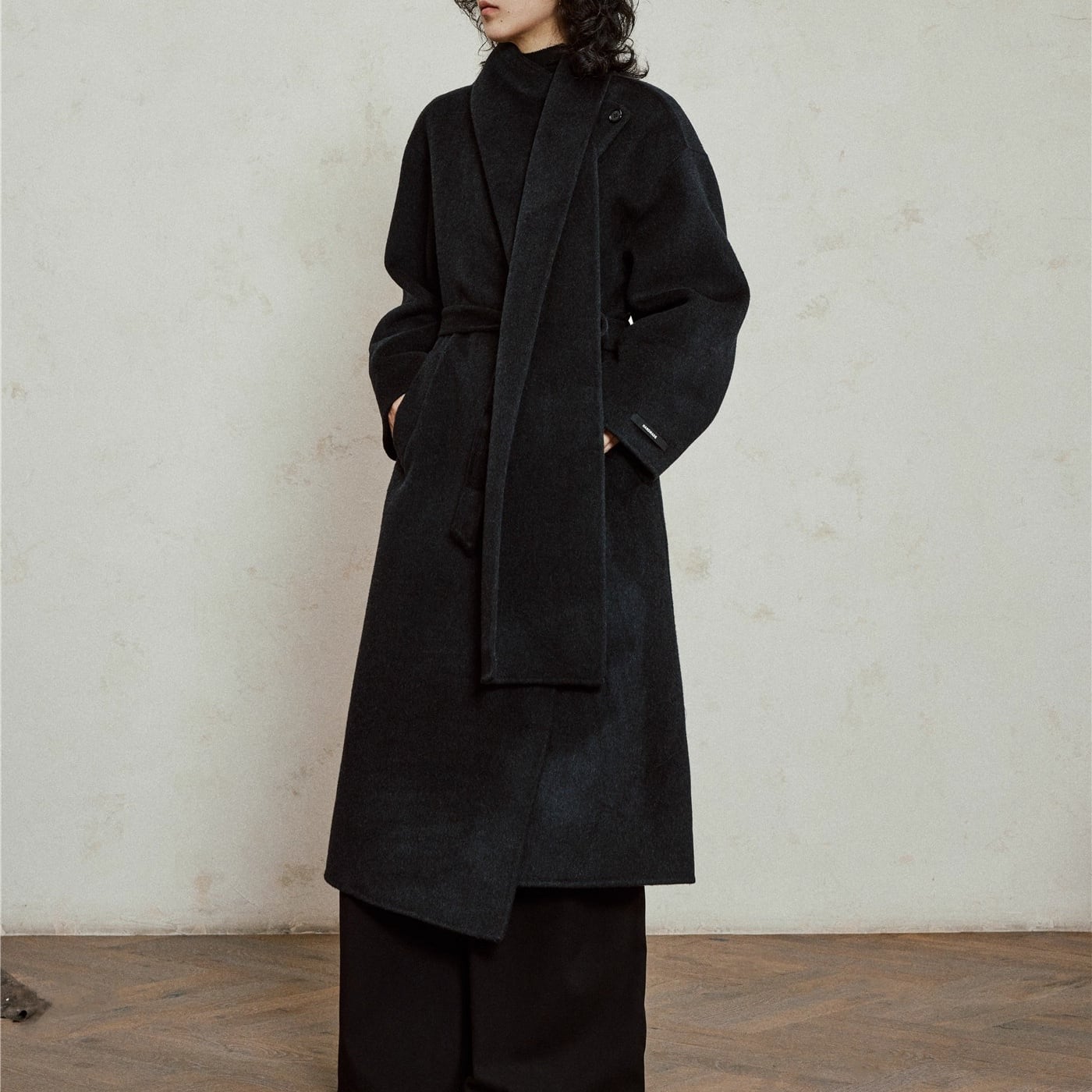 首元のドレープが印象的なロングコート。ミニマルなデザインながらも、ドレープとマフラーがアクセントとなり、スタイリングに奥行きを与えます。普段使いはもちろん、ちょっとしたお出かけにも羽織るだけで洗練された印象に。