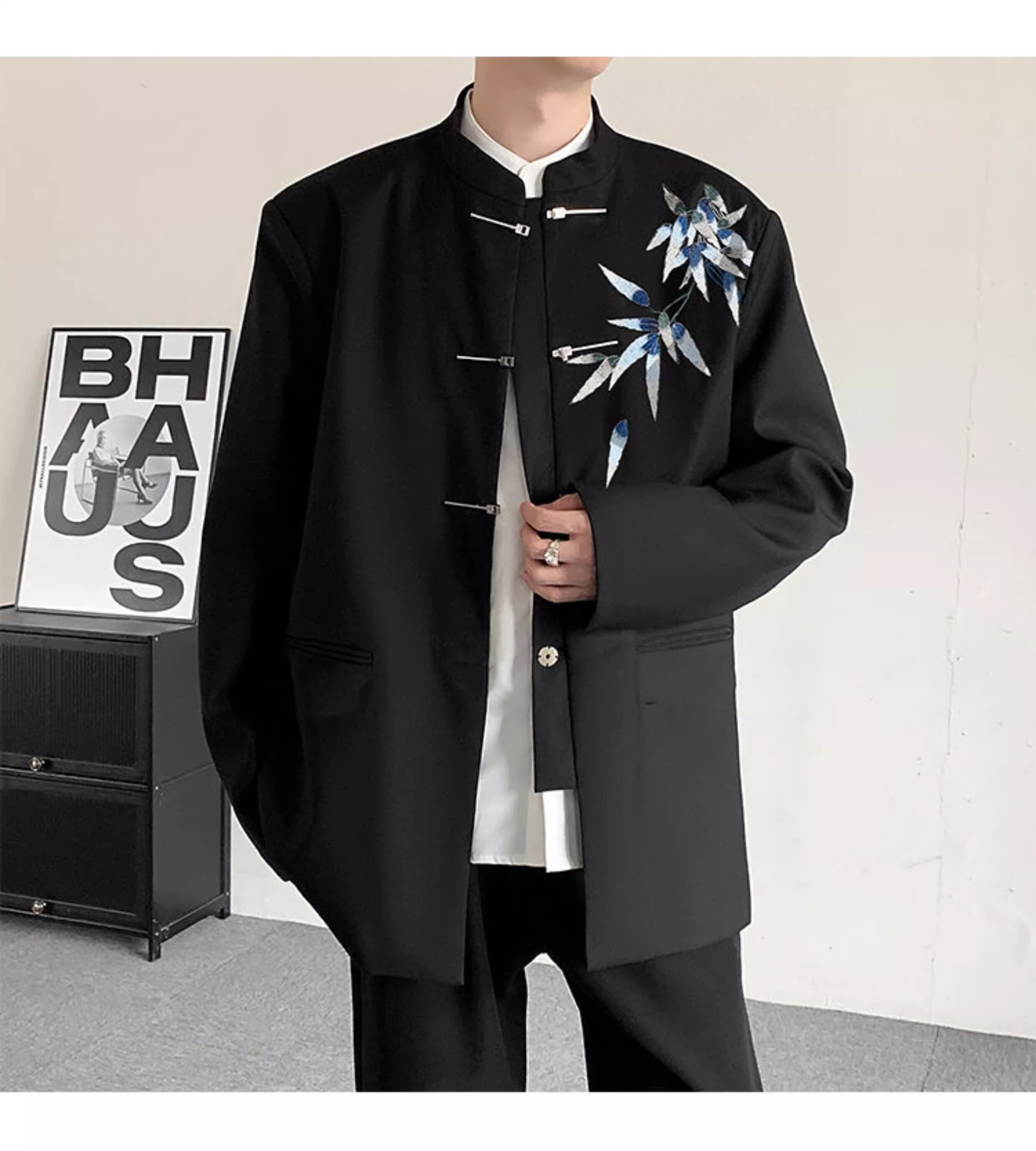 スタンドカラーとチャイナボタンが特徴的なジャケット。胸元の刺繍がアクセントとなり、個性を演出します。普段使いはもちろん、少しフォーマルな場面にも対応できる汎用性の高さが魅力。シンプルなボトムスと合わせることで、洗練された大人の着こなしが完成します。
