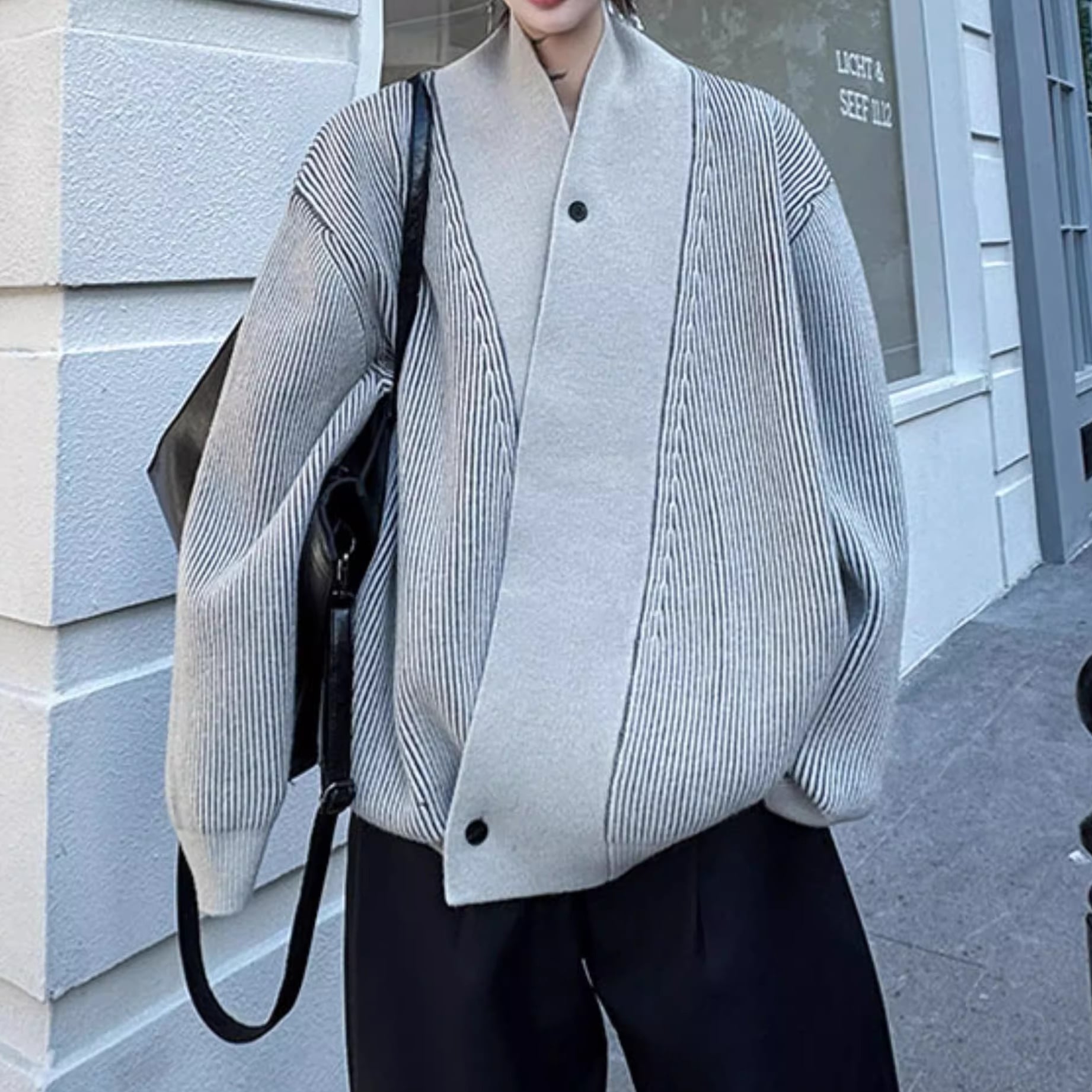 リブ編みの素材感が、落ち着いた印象を与えつつ、洗練された雰囲気を醸し出します。