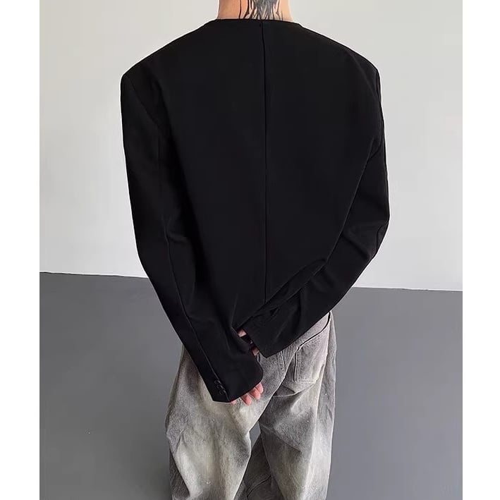個性的なボタンデザインが目を引くノーカラージャケット。