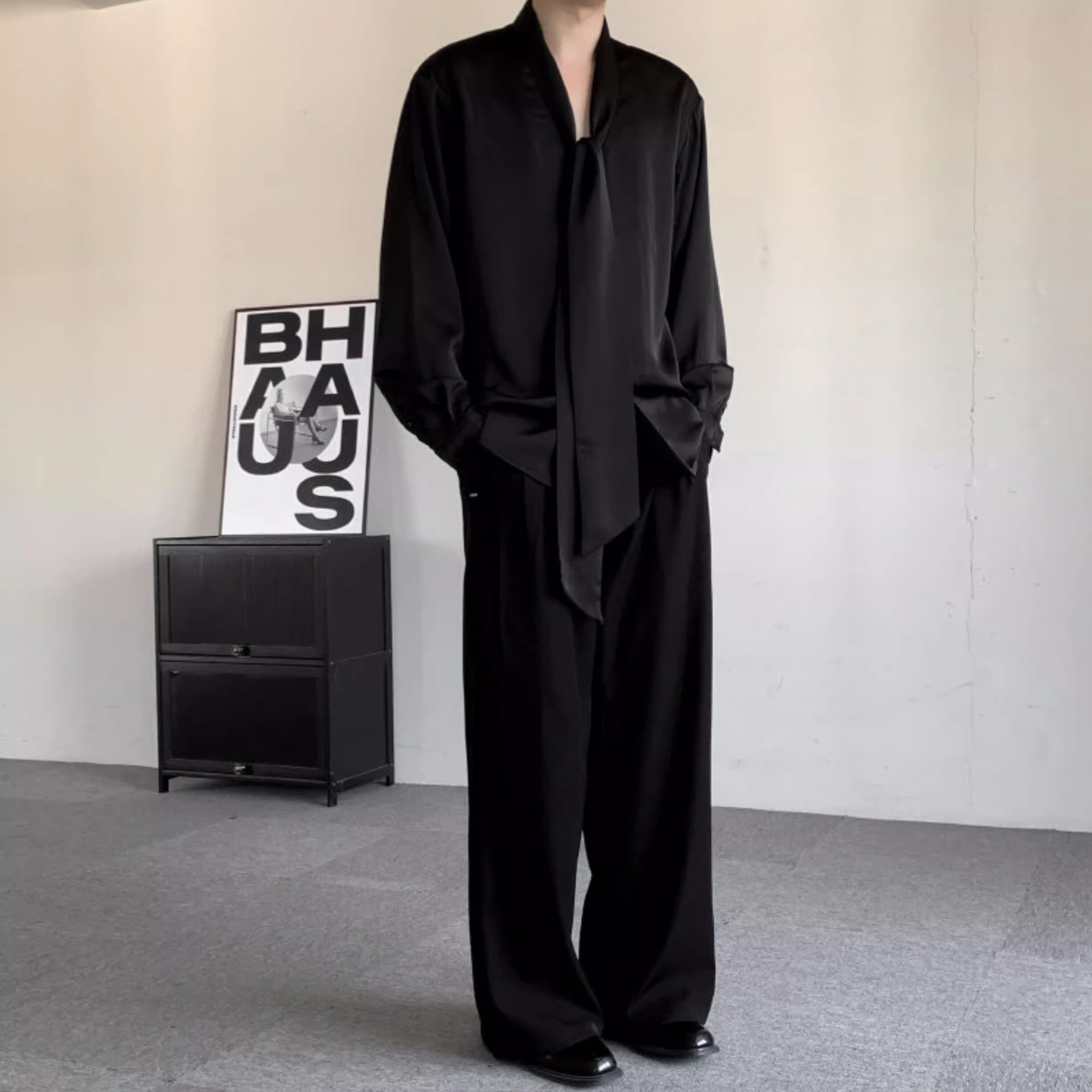 首元のボウタイが目を引く、スタイリッシュなトップス。