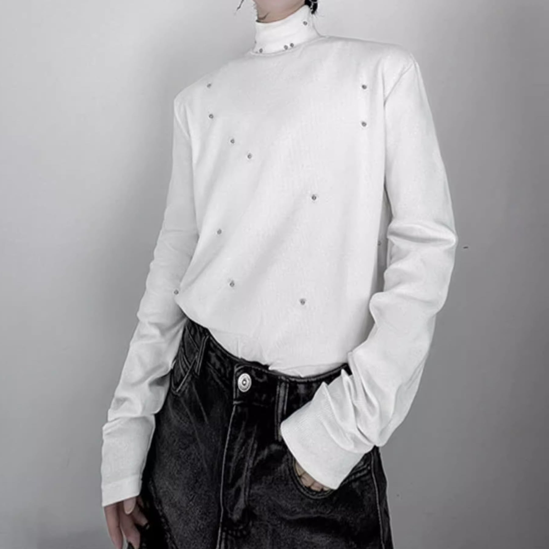 ミニマルなデザインの中に、ビーズの装飾がさりげないアクセントを加えるタートルネックトップス。