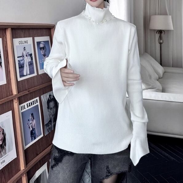 ハイネックデザインが、顔周りをすっきりと見せ、洗練された印象を与えます。