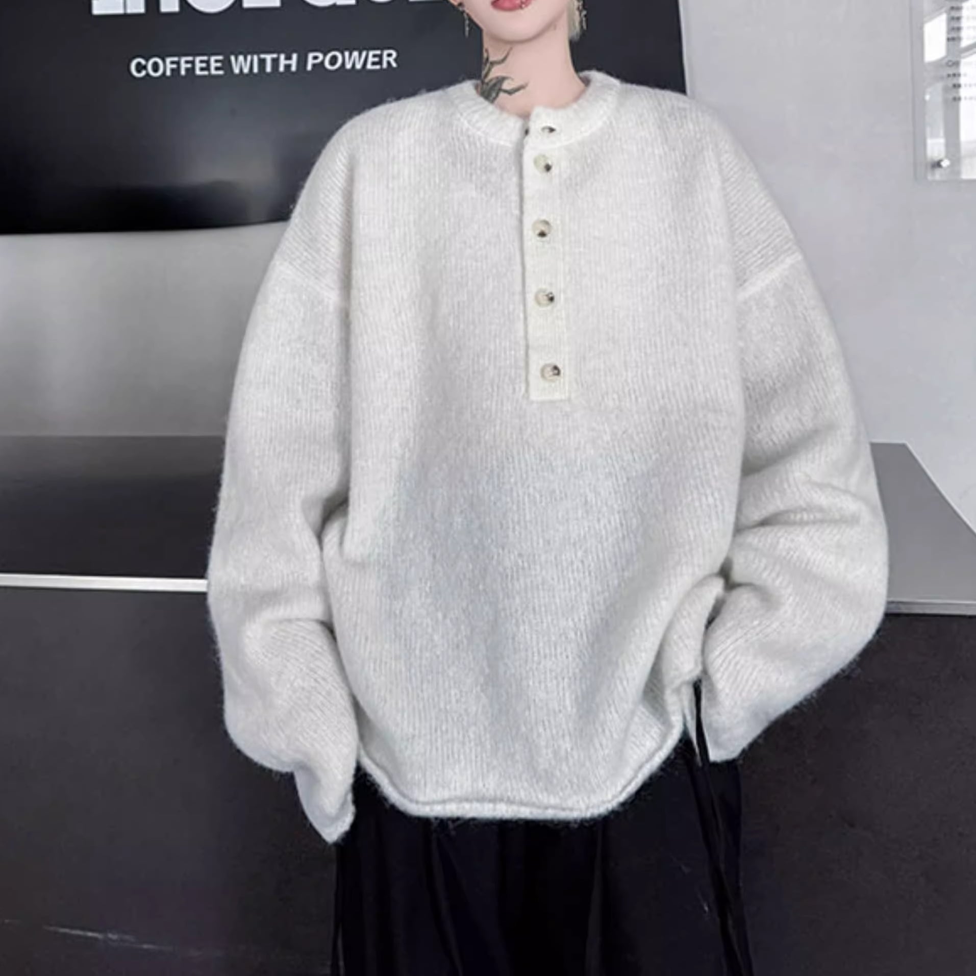 ルーズなシルエットで、リラックスした着心地のオーバーニットです。ヘンリーネックのデザインが、カジュアルながらも洗練された印象を与えます。普段使いはもちろん、少しゆったりめのボトムスと合わせて、こなれ感のあるスタイリングにもおすすめです。