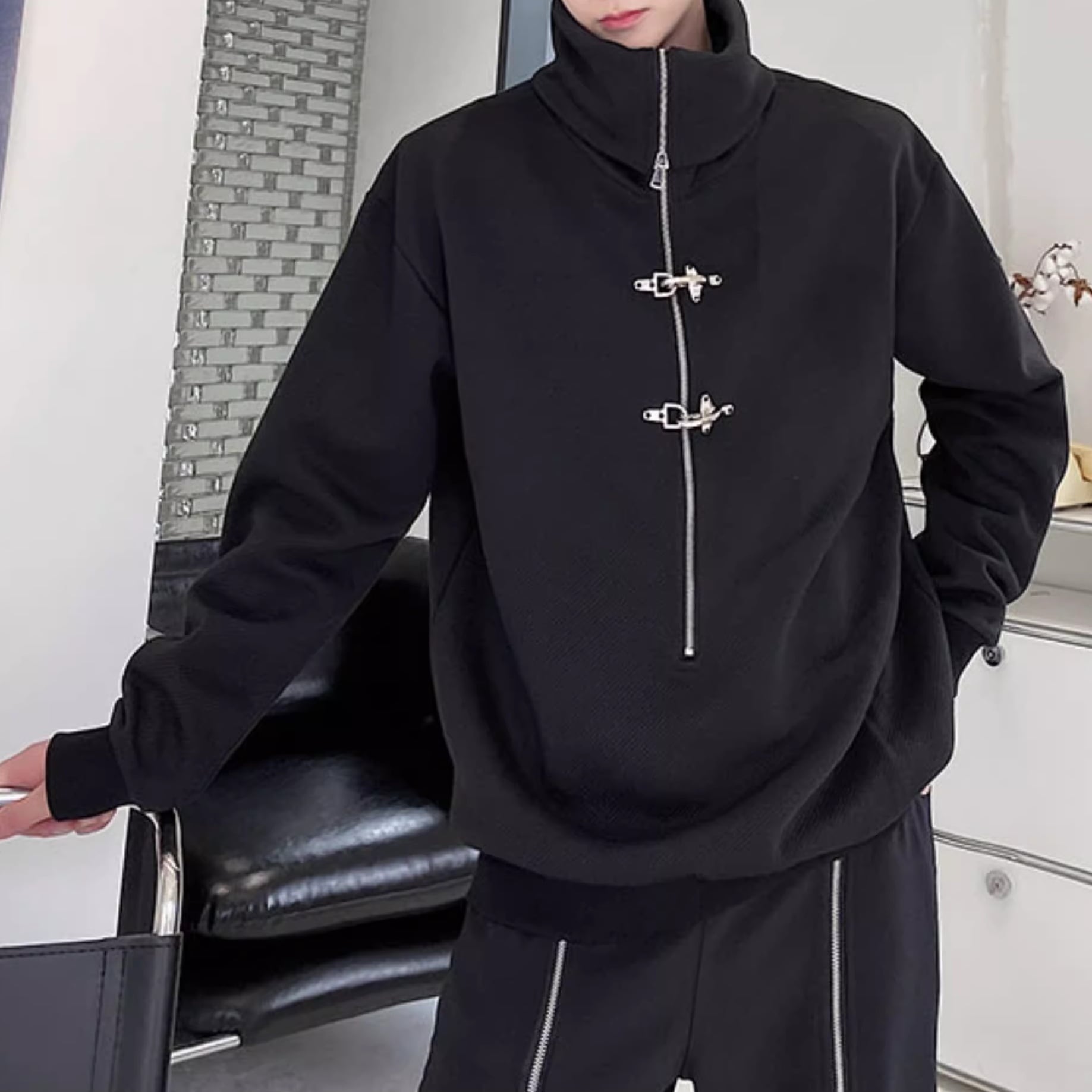 ハーフジップとメタルの留め具がアクセントになった、個性的なトップス。