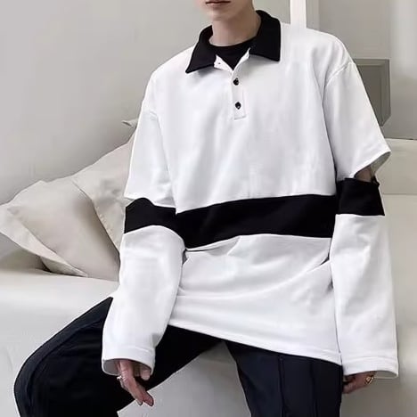 バイカラーデザインが目を引く、個性が際立つポロシャツ。