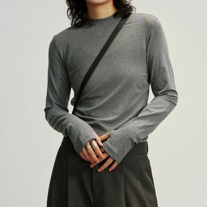 ミニマルなデザインが際立つ長袖モックネックカットソー。