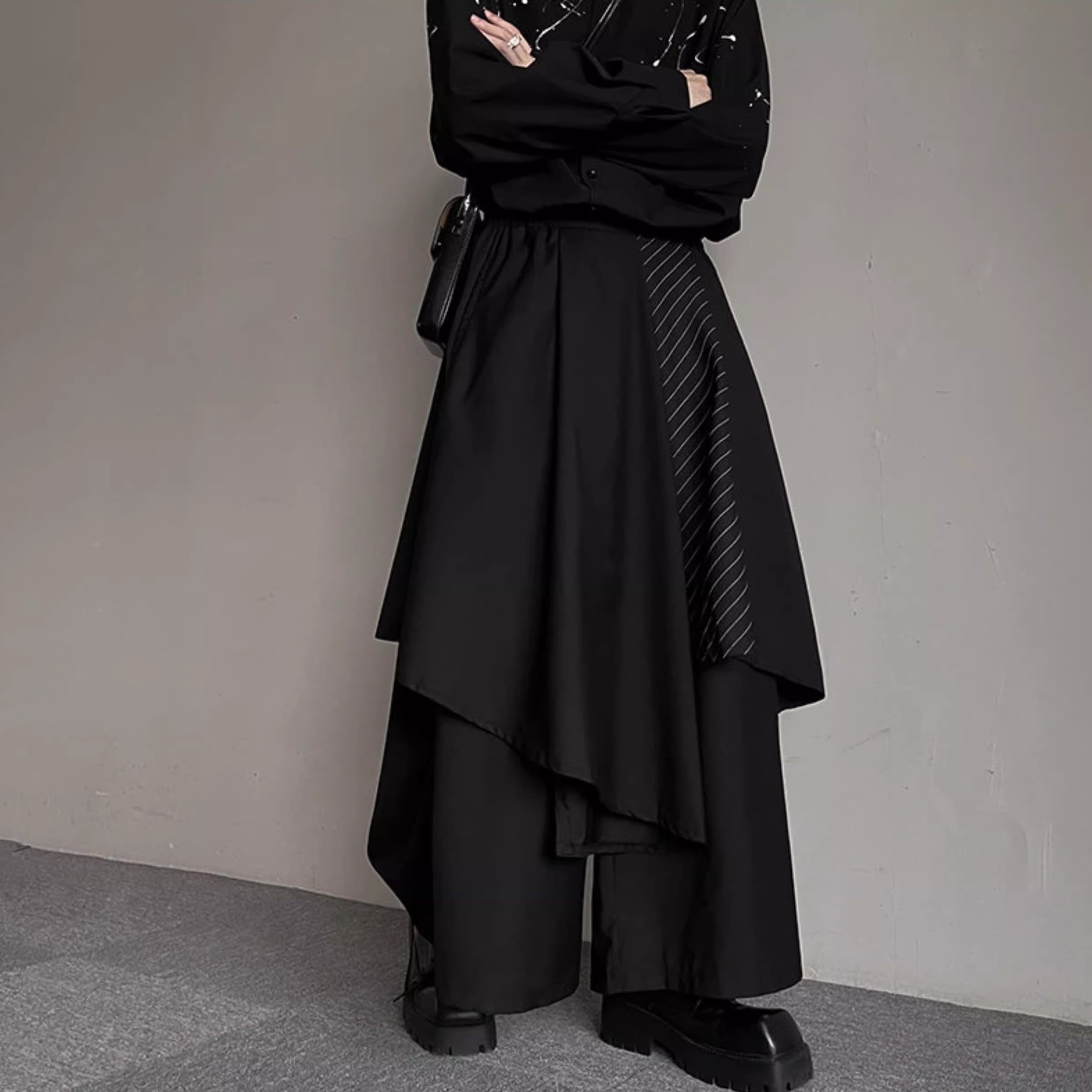 アシンメトリーなラップデザインが目を引く、ワイドパンツ。