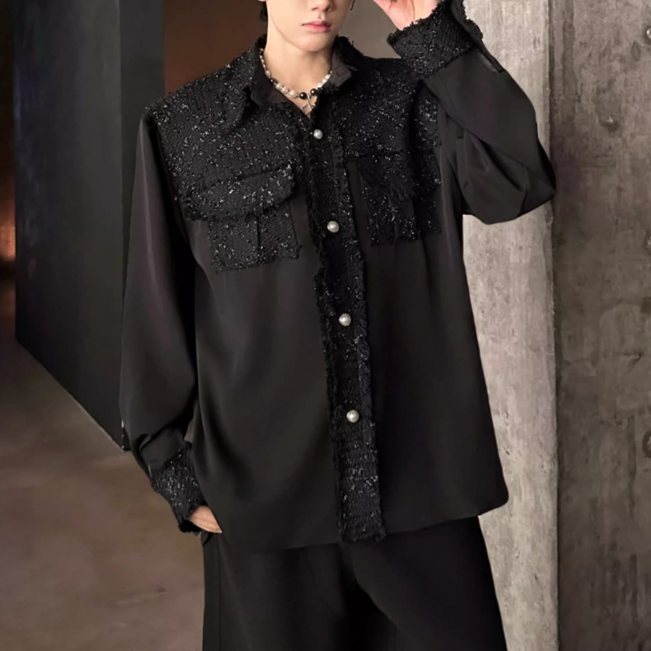 胸元のスパンコールが目を引く、個性を演出するシャツ。