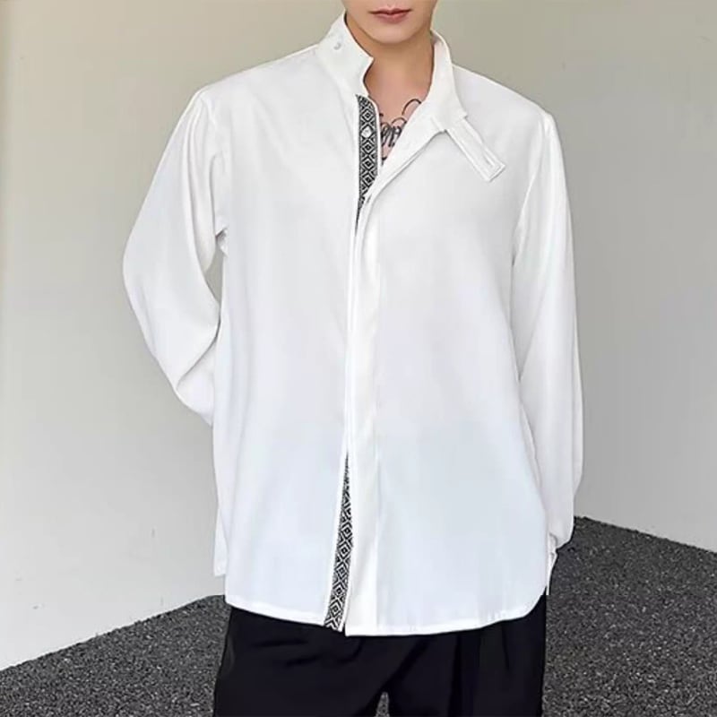 首元のデザインがアクセントになった、おしゃれなバンドカラーシャツ。