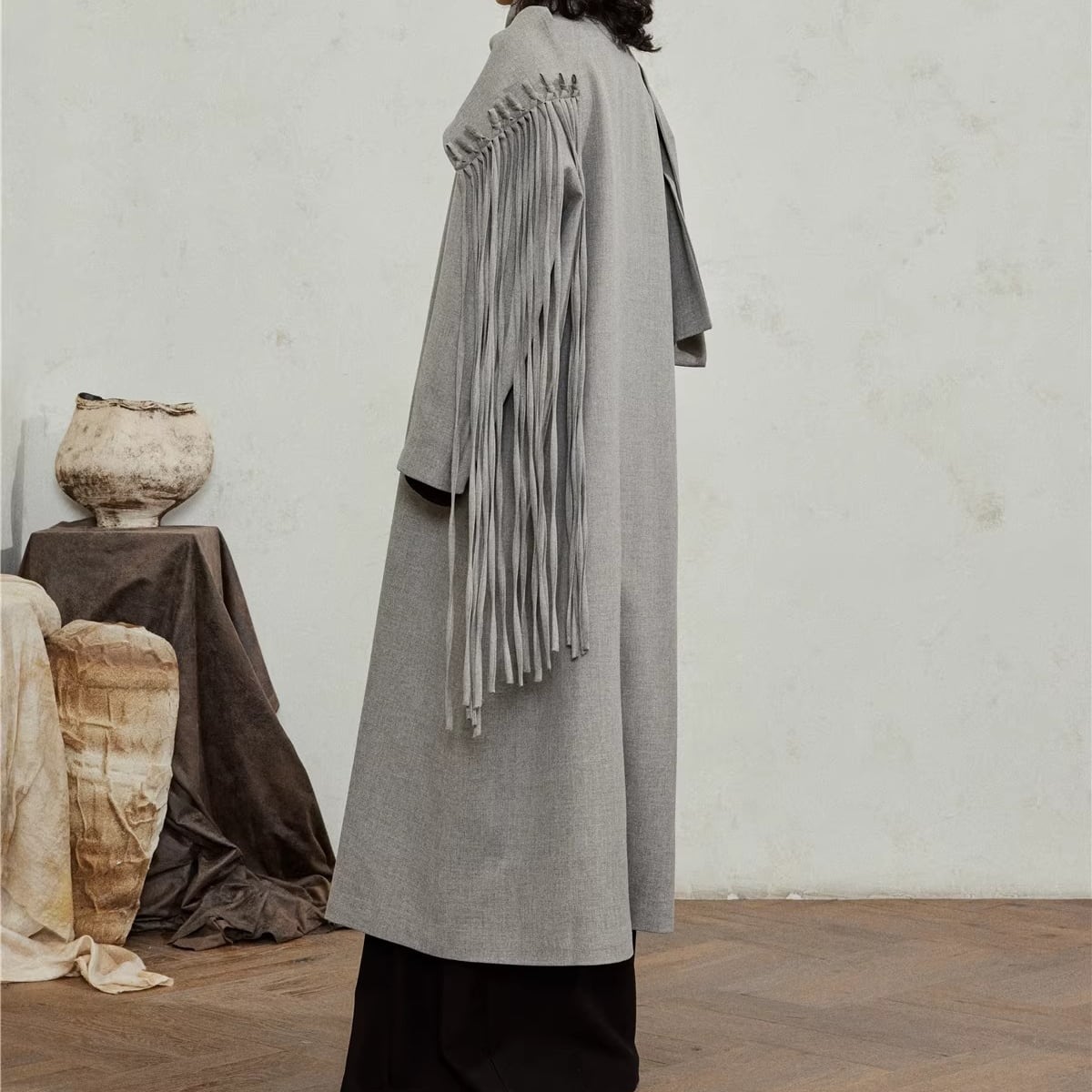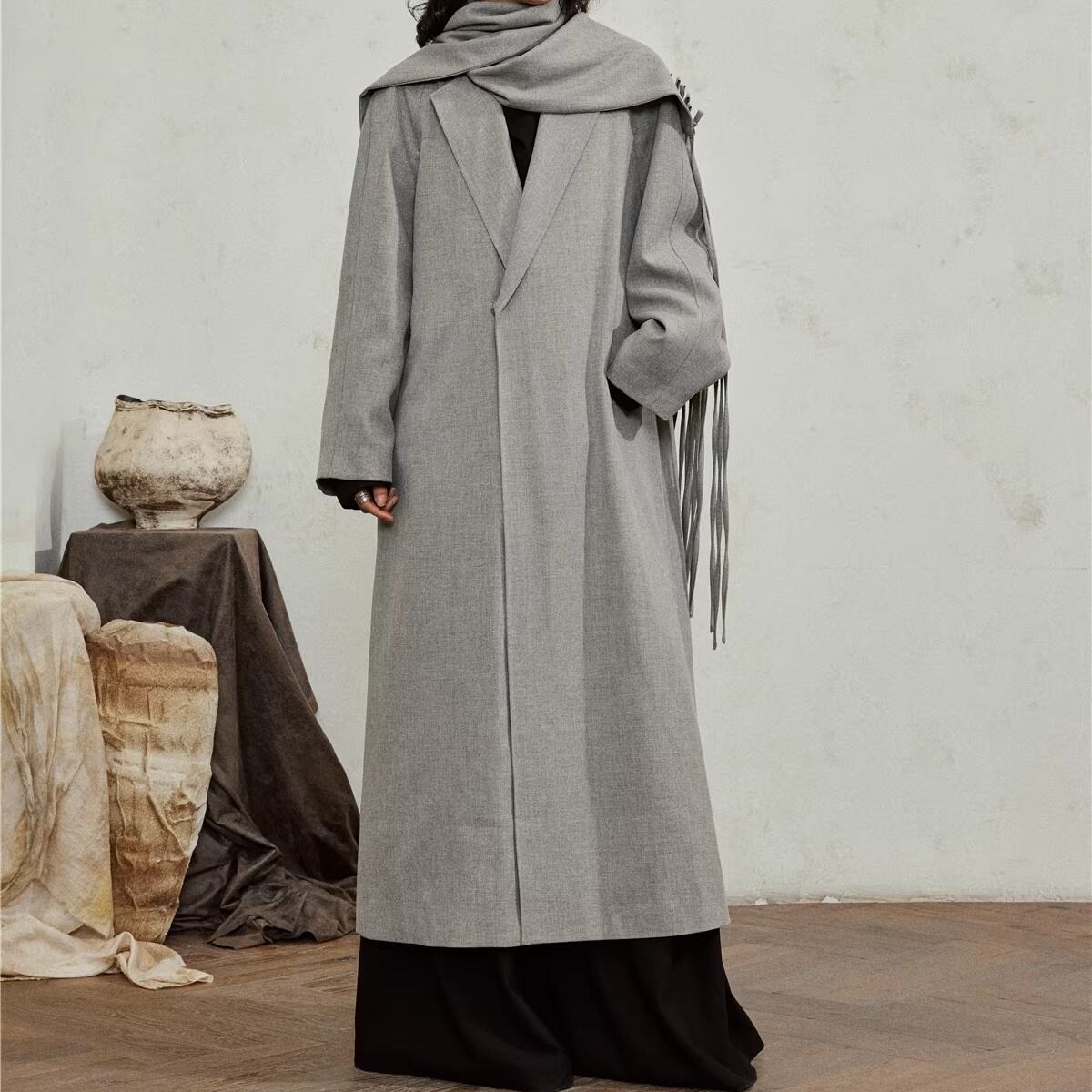 プリーツディテール ロング丈 ドレープカラー コート 2color MOJ0351