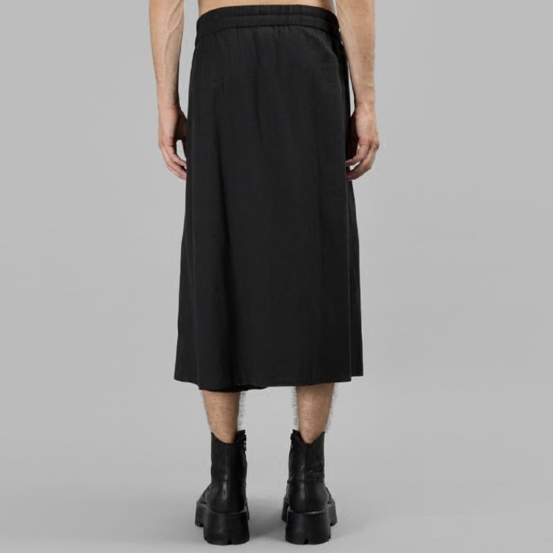 パンツとのレイヤードスタイルが楽しめる個性的なデザインのメンズスカートです。