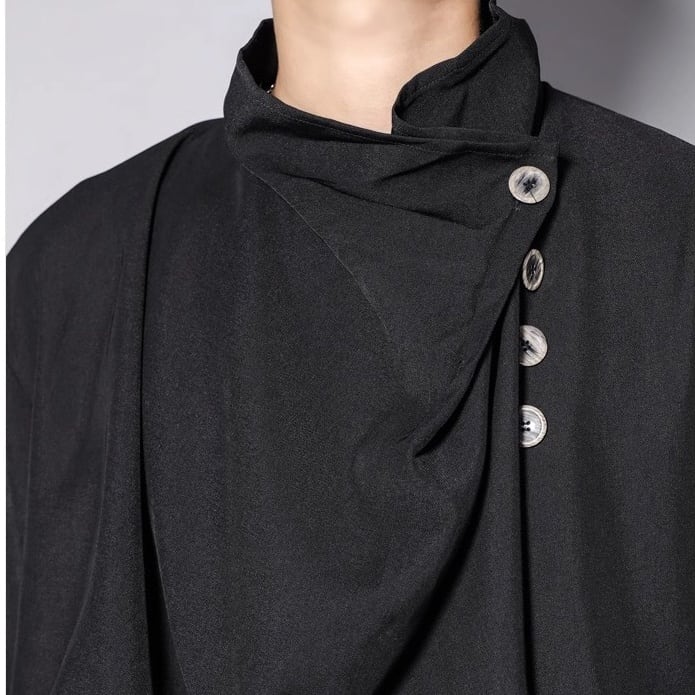スタンドカラーとアシンメトリーなデザインが特徴的なロングスリーブシャツ。寄せられたボタンが、個性的な雰囲気を醸し出します。ワイドパンツとの相性も良く、モードファッションが好きな方には重宝される一着。